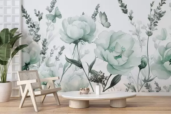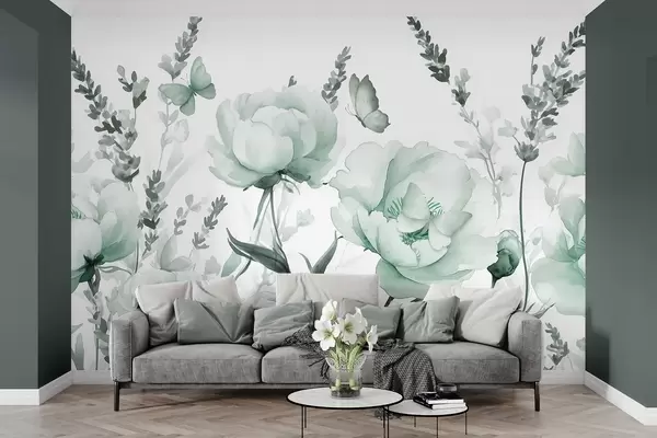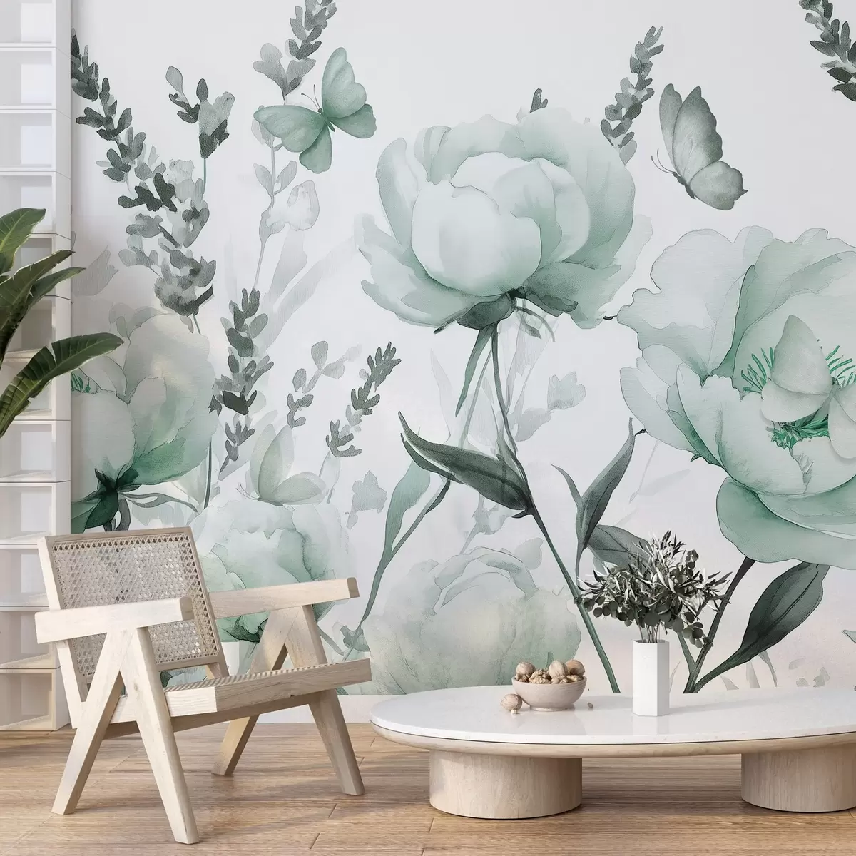 Fototapeten Blumenwiese, Pfingstrosen, Lavendel, Schmetterlinge, Aquarellstil, grüne Farben N° w03668v1