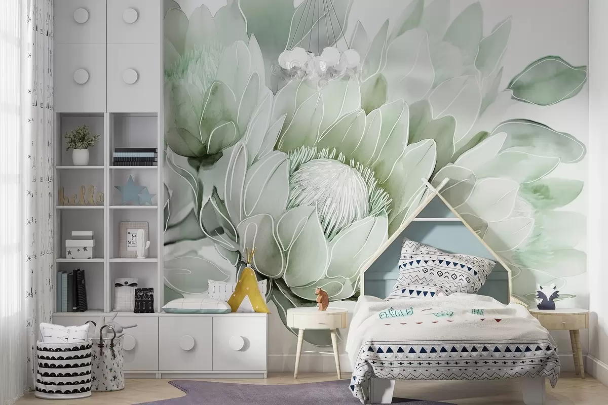 Fototapeten Schöne Protea Blumen, Strichzeichnung, tropische, grüne Farben N° w03669v2