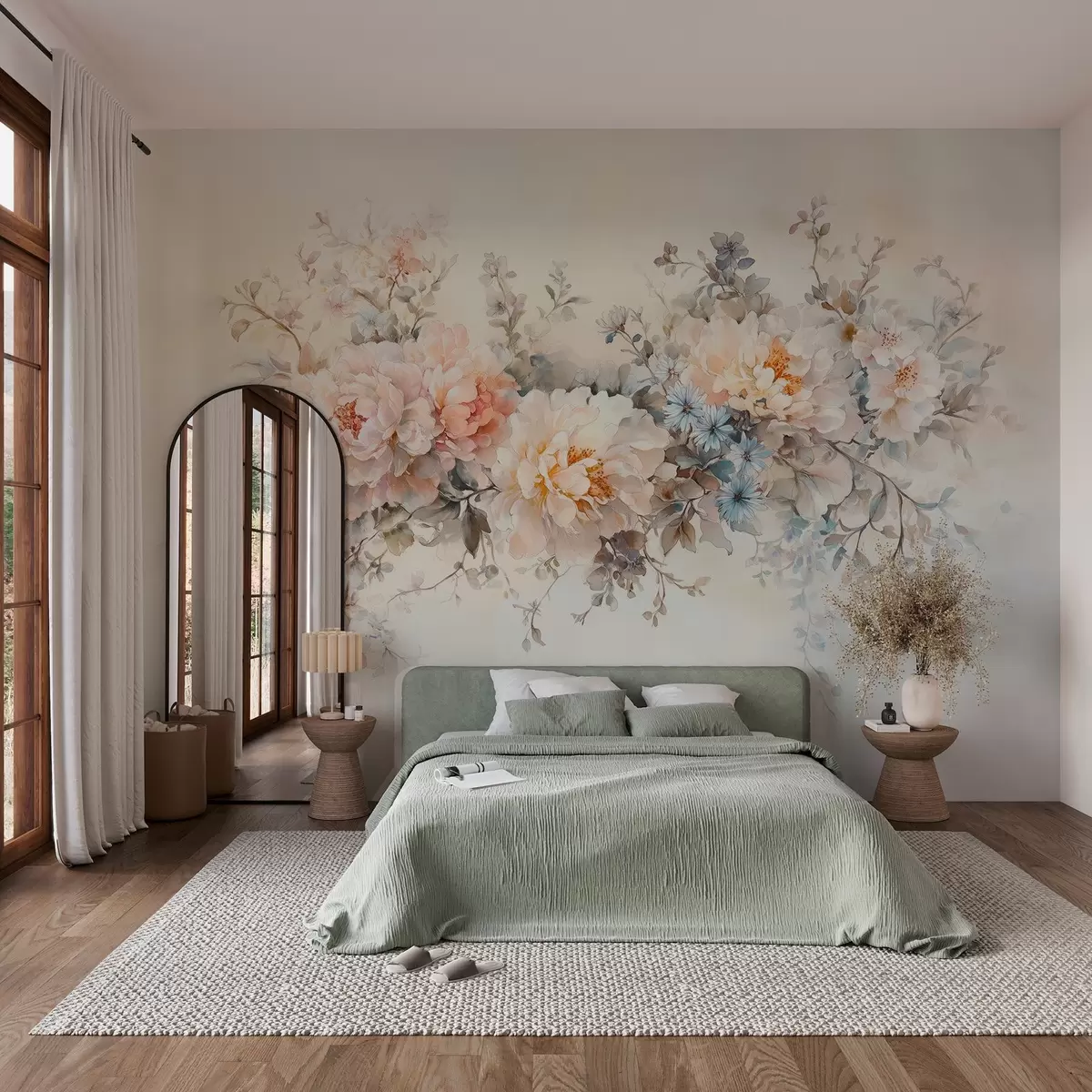 Fototapeten zarte Blumen im Aquarellstil in Pastelltönen von Rosa, Beige und Blau N° w03724