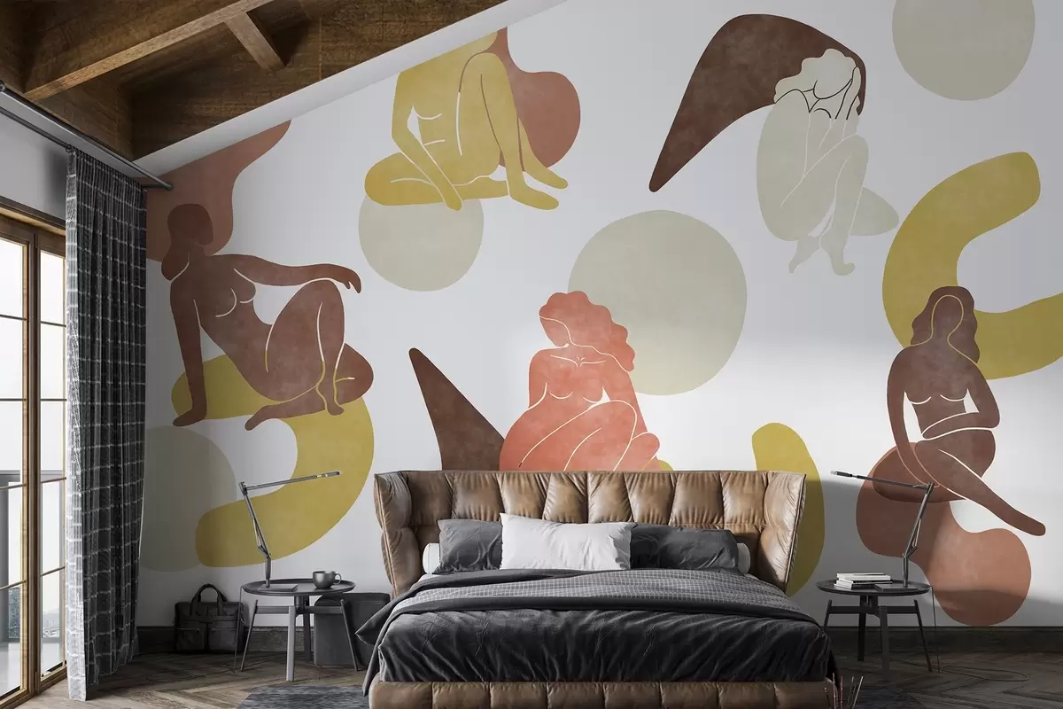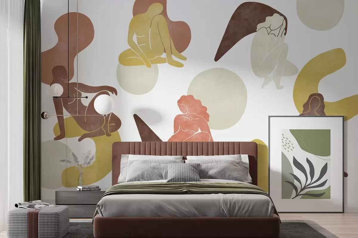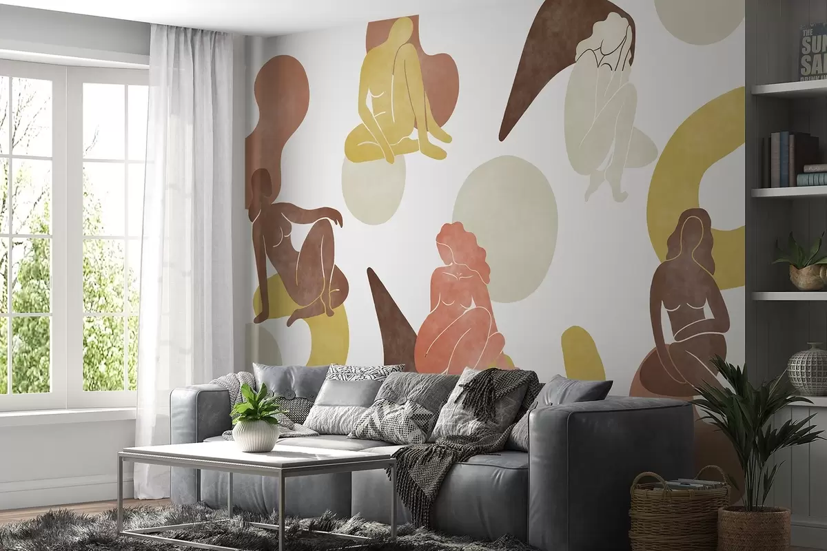 Fototapeten Geometrische Abstraktionen mit weiblichen Silhouetten, Boho-Stil, braun, beige, gelb N° w03753v2