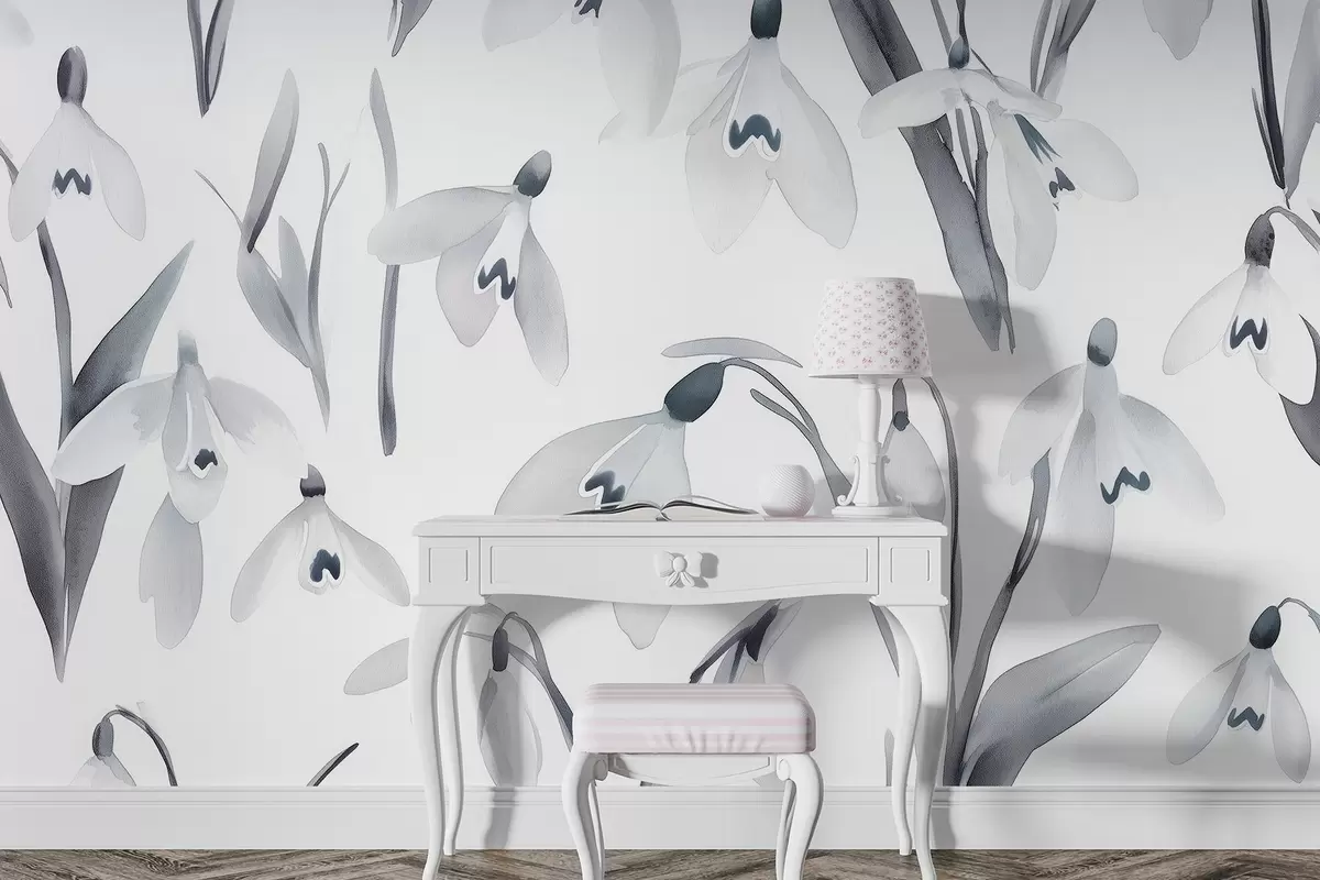 Fototapeten Schneeglöckchen Blumen in Aquarell-Stil, graue Farben N° w03754v1