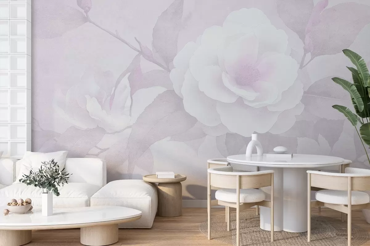 Fototapeten Sanftes Pastell mit Kamelienblüten auf dem Zweig, rosa Farben N° w03760v2