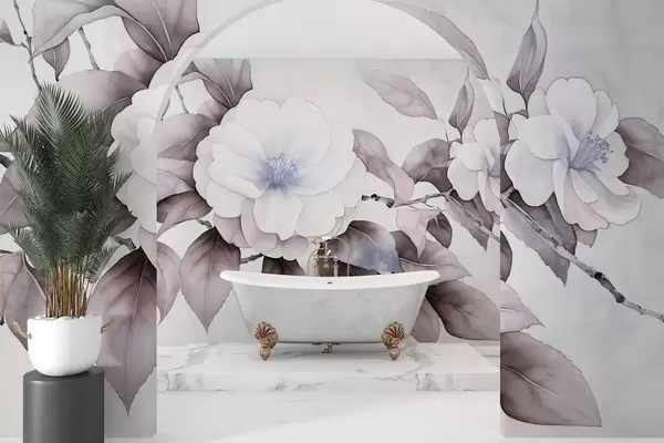 Fototapete Aquarell-Stil Kamelie Blumen auf dem Zweig, lila Farben w03761v1