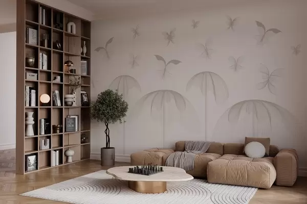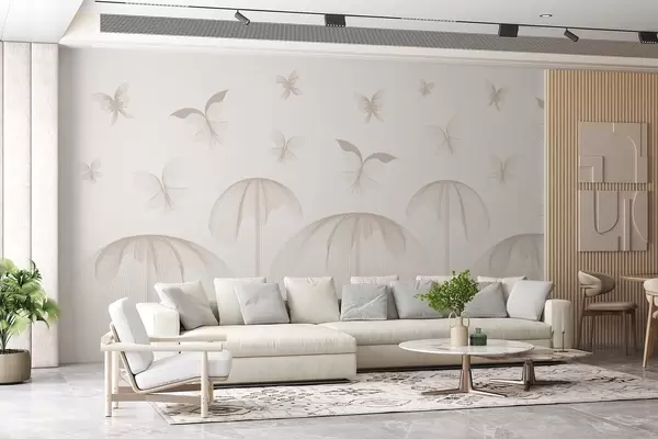 Fototapeten minimalistische lineare Tapete Schmetterlinge und Springbrunnen auf milchigem Hintergrund N° w03762