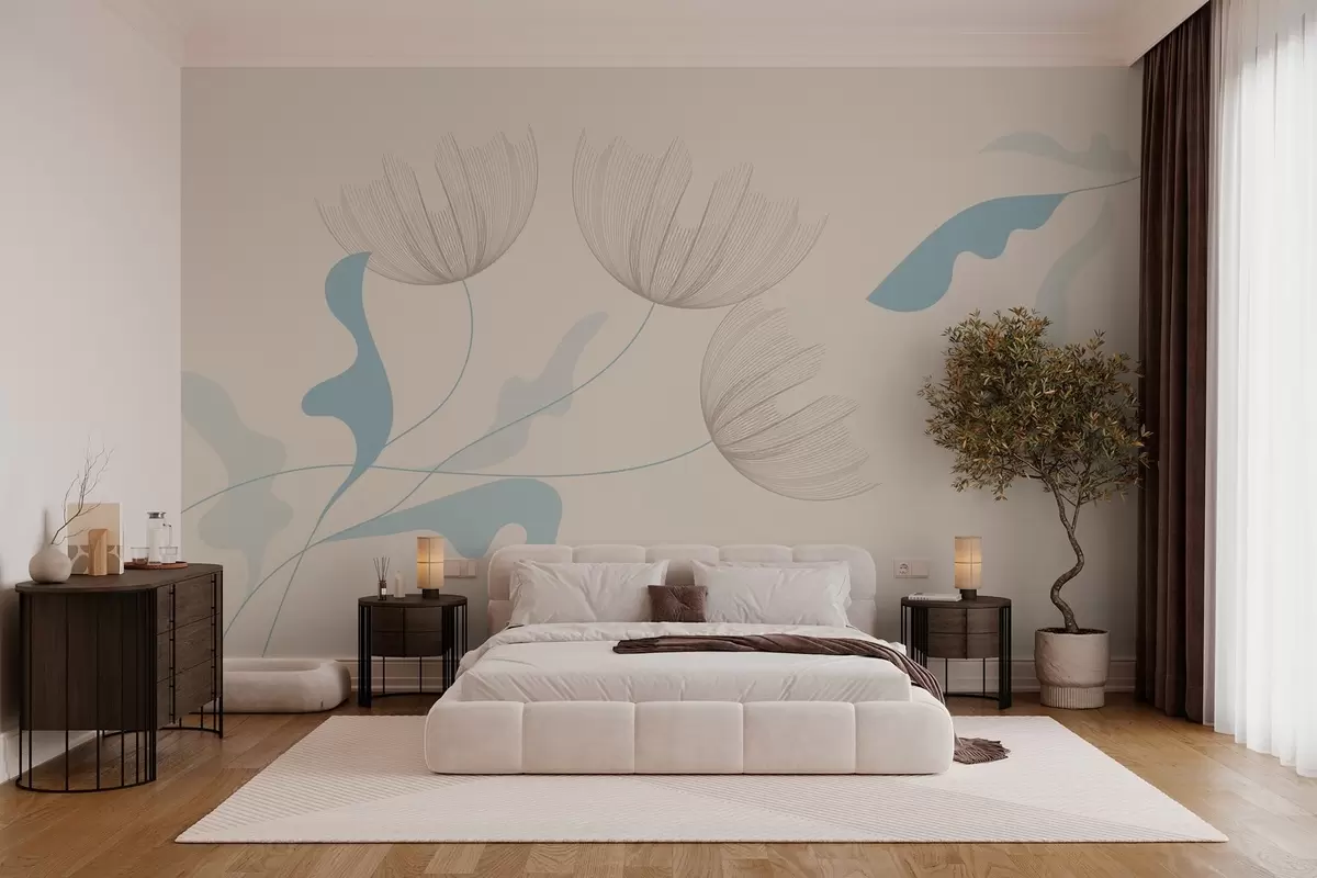 Fototapeten elegante minimalistische Blumen in hellen Blautönen auf beigem Hintergrund N° w03763v1