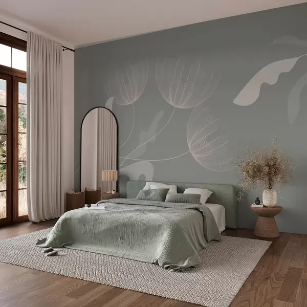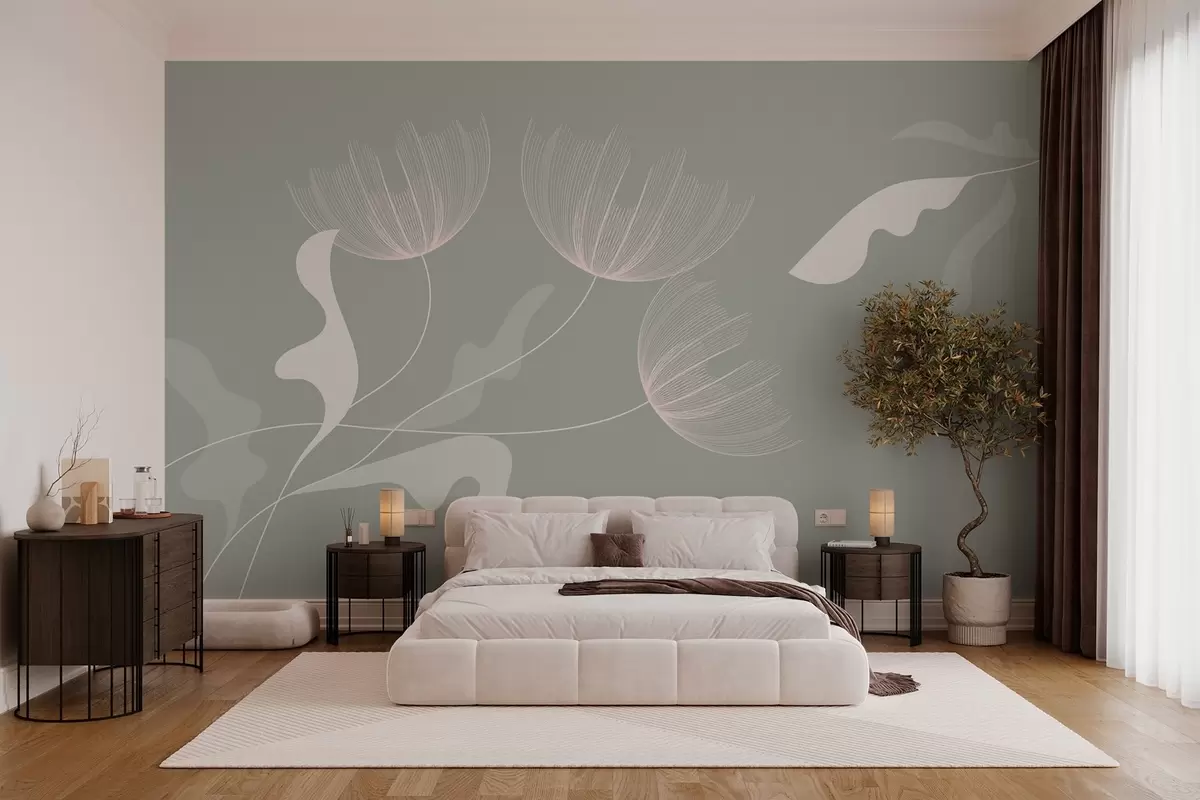 Fototapeten elegante minimalistische Blumen in Grüntönen auf beigem Hintergrund N° w03763v2