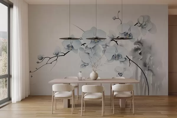 Fototapeten Aquarellierte Orchideen im japanischen Stil auf hellem Hintergrund N° w03795