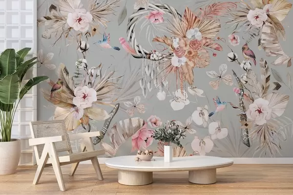 Fototapeten Boho-Stil Ornament mit Pfingstrose Blumen und Vögel, Aquarell-Stil, beige Farben N° w03885