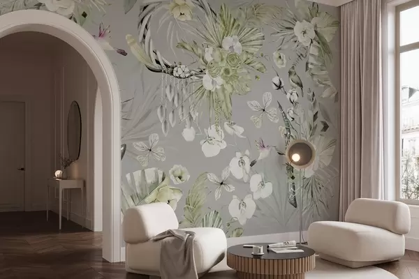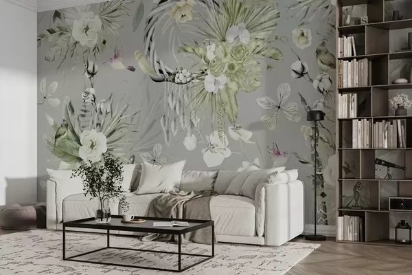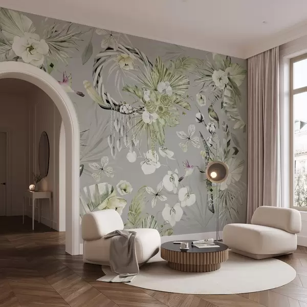 Fototapeten Boho-Stil Ornament mit Pfingstrose Blumen und Vögel, Aquarell-Stil, grüne Farben N° w03885v2