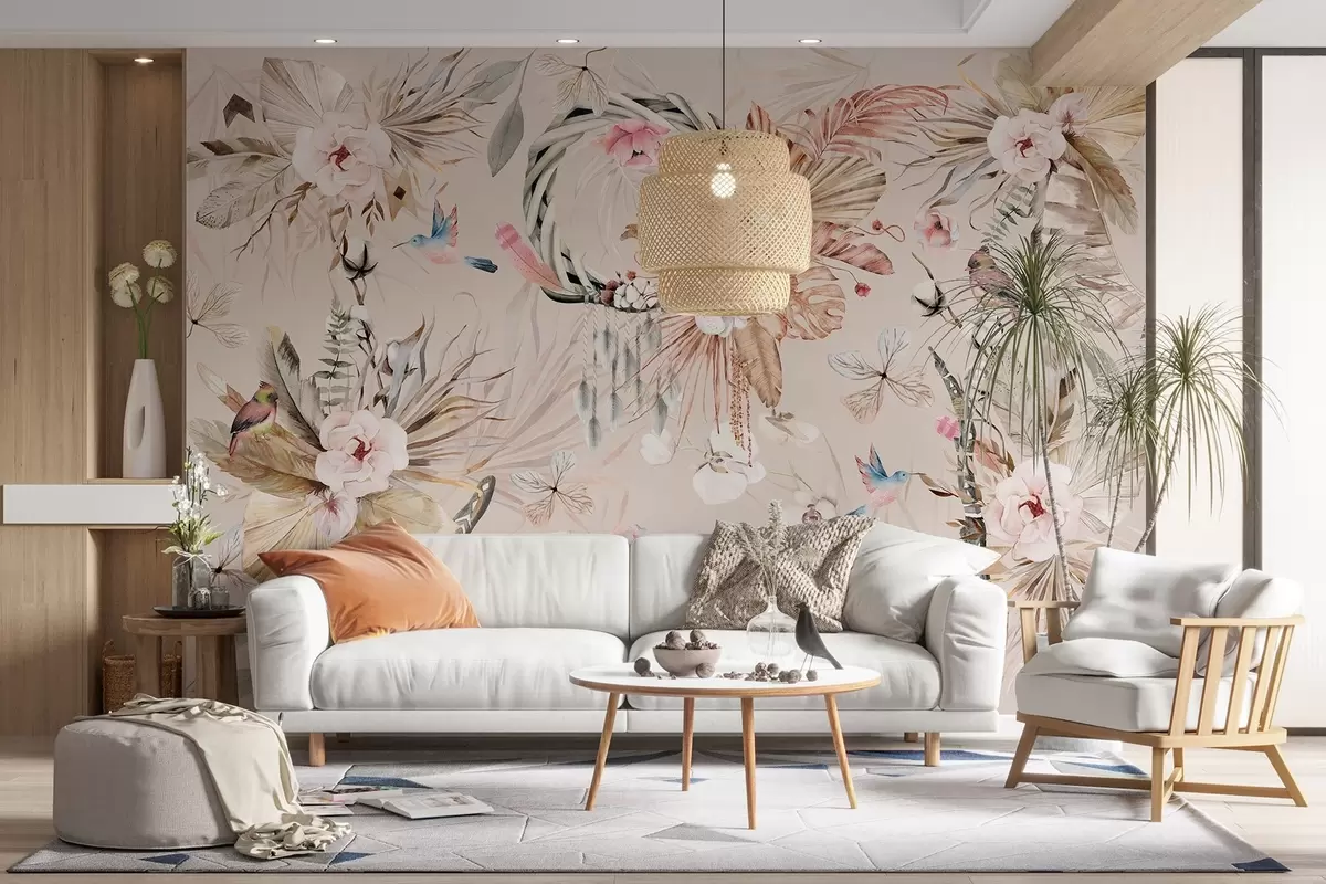 Fototapeten Boho-Stil Ornament mit Pfingstrose Blumen und Vögel, Aquarell-Stil, weiche Farben N° w03885v3