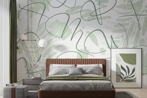 Fototapeten Kalligraphische Abstraktion mit Buchstaben, Pinselstrichen, grüner Farbe N° w03913v3
