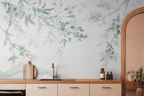 Fototapeten Blühende Zweige, Nachahmung eines Aquarells, Grüntöne N° w03935v3