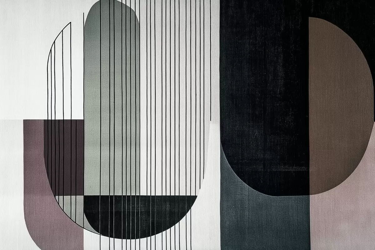 Fototapeten moderne abstrakte geometrische Komposition mit sich überschneidenden Formen und vertikalen Linienmustern, dünne Linien, die Trapeze und Ovale ausfüllen, weiche Texturüberlagerung, warme gedämpfte Töne wie Olivgrün, Taupe, Beige und Anthrazit, subtile Transparenzeffekte zwischen den Formen N° w03937v1