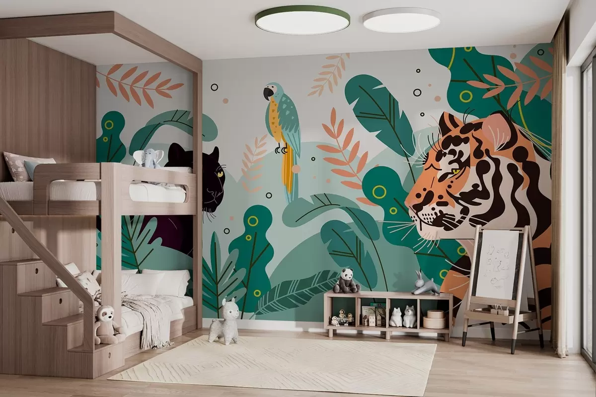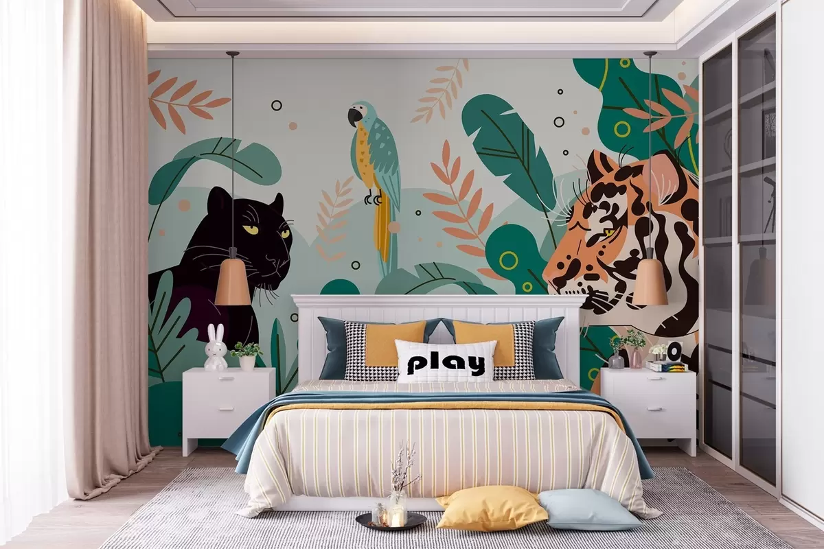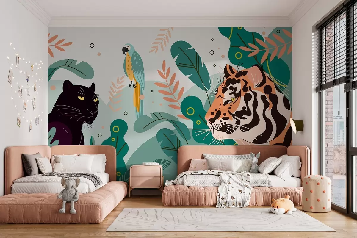 Fototapeten dschungel mit Tiger, Panther und Papagei N° w03958