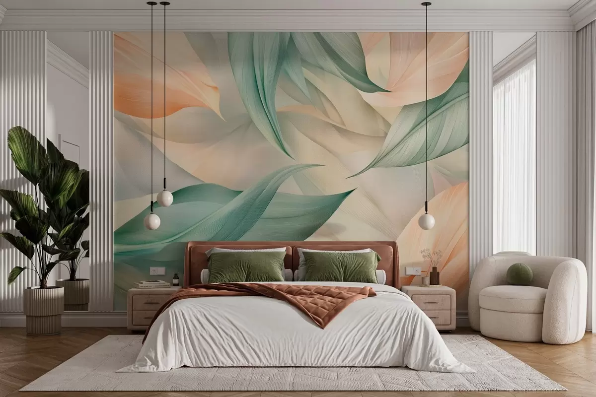 Fototapeten exotische tropische Blätter in zarten Pfirsich- und Grüntönen N° w03962