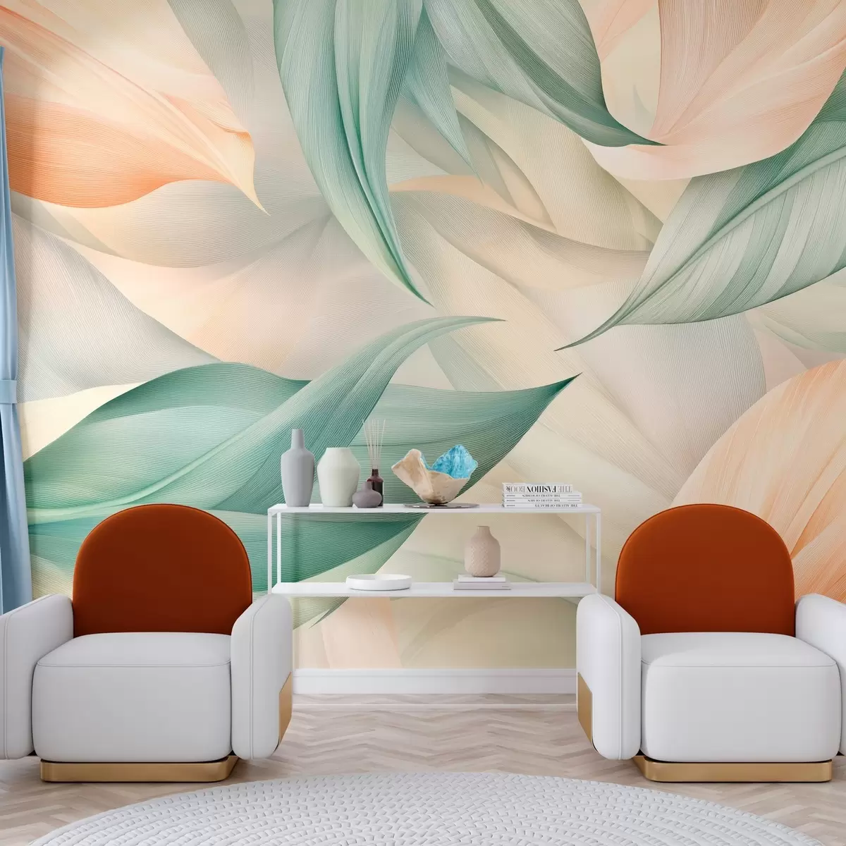 Fototapeten exotische tropische Blätter in zarten Pfirsich- und Grüntönen N° w03962
