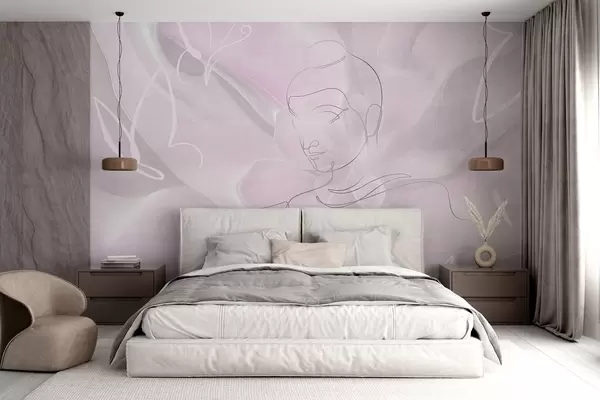 Fototapeten Florale Abstraktion mit Buddha-Linienzeichnung, rosa Farben N° w04004v2