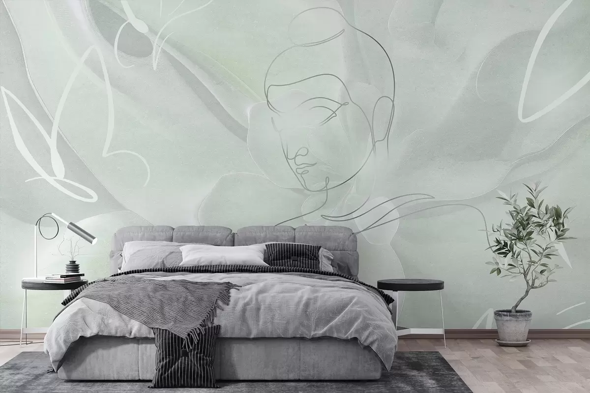 Fototapete Florale Abstraktion mit Buddha-Linienzeichnung, grüne Farben w04004v3