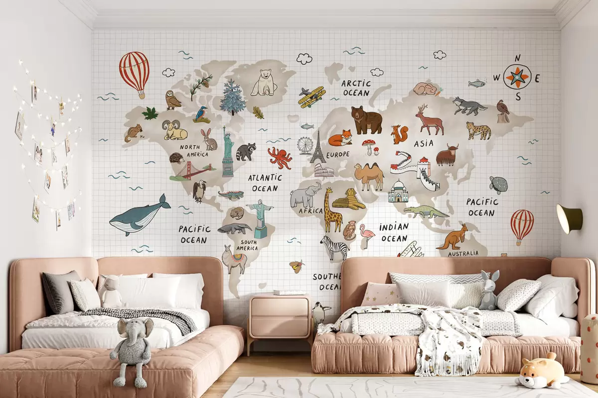 Fototapeten Weltkarte mit Tieren und Wahrzeichen N° w04011