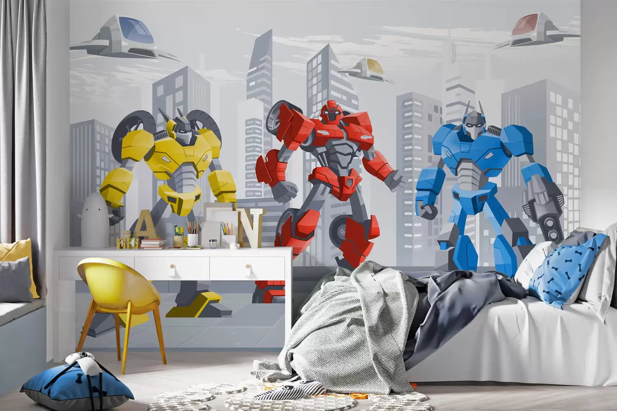 Fototapeten Transformationsroboter vor der Kulisse einer monochromen Stadt N° w04012