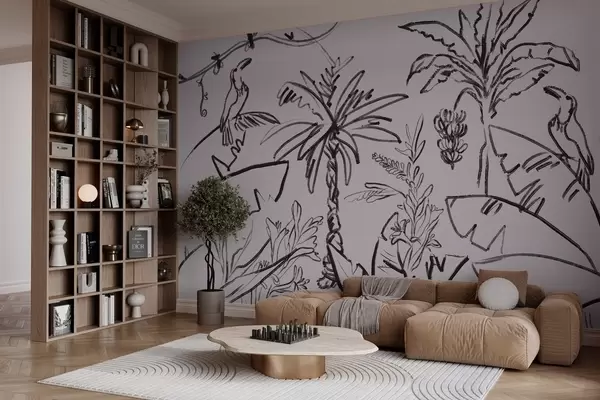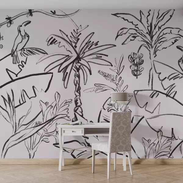 Fototapeten Tropisches Muster in schwarzer Farbe, Palmen, Bananen, Umrissgrafik N° w04020v7