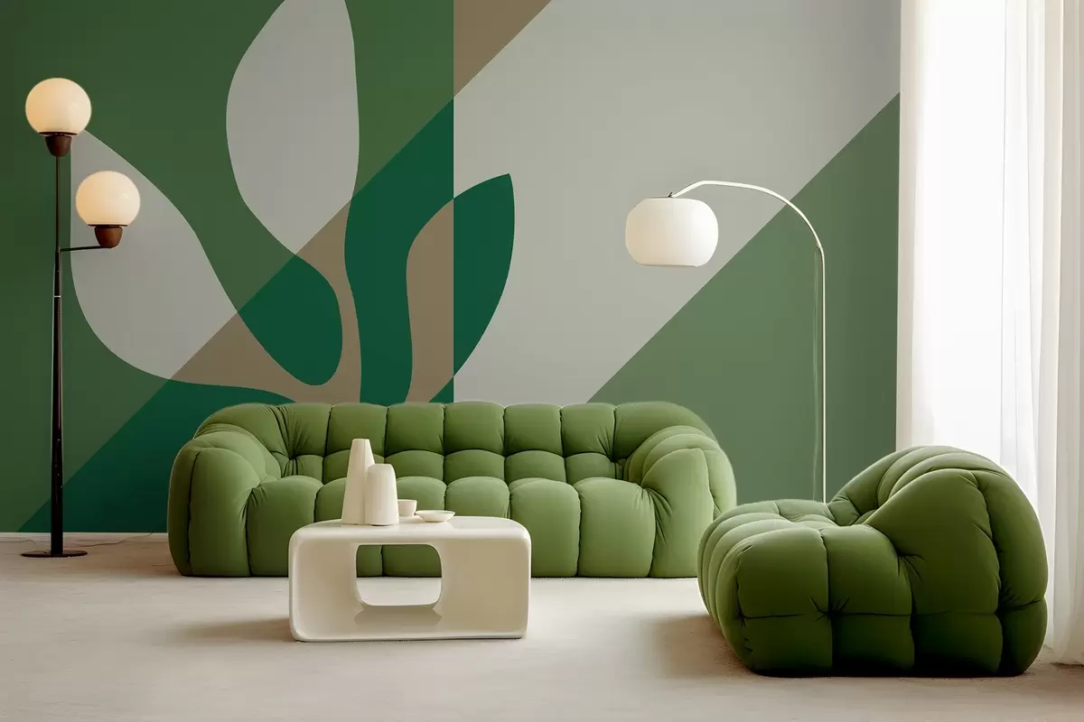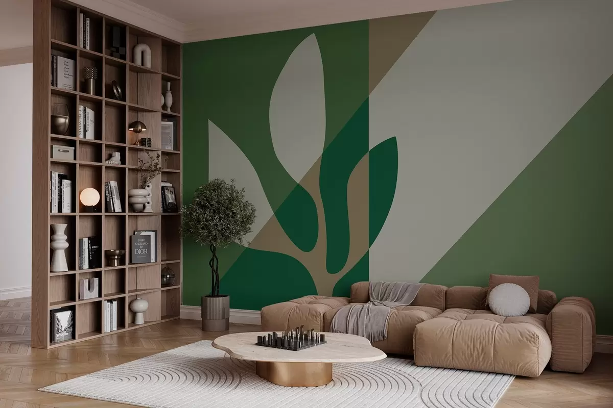 Fototapeten abstrakte Grafik Pflanze auf dem Hintergrund der Geometrie in grün und ocker Farben N° w04028