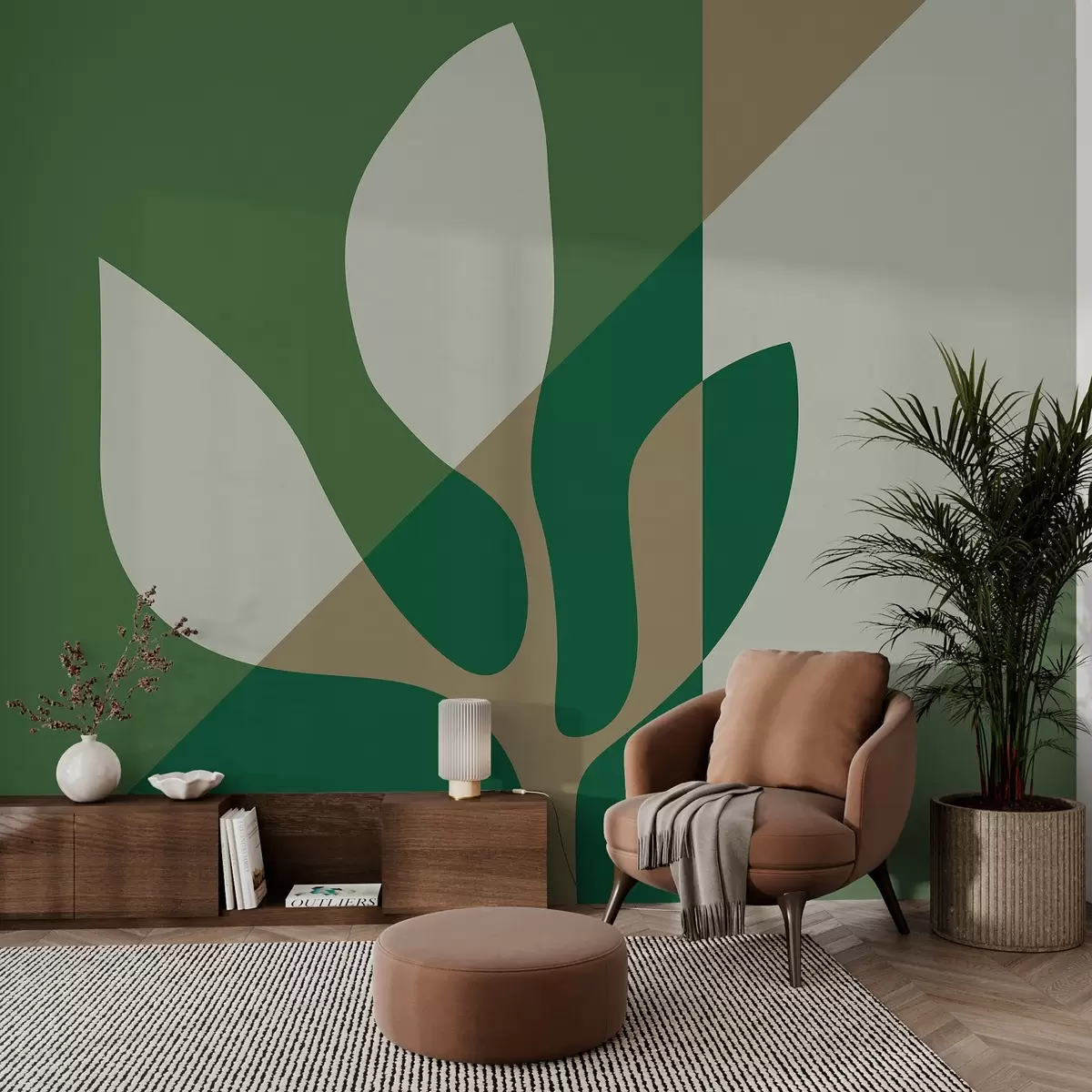 Fototapeten abstrakte Grafik Pflanze auf dem Hintergrund der Geometrie in grün und ocker Farben N° w04028