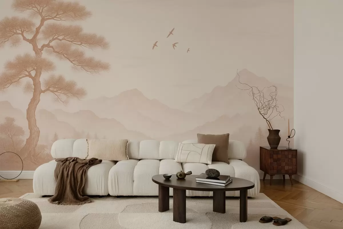 Fototapeten panorama von Hügeln mit einem großen Baum in Mokka-Tönen N° w04033v1
