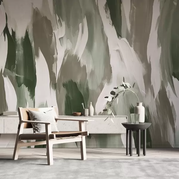 Fototapeten Abstrakte Pinselstrichkomposition in erdigen Grüntönen, Taupetönen und Elfenbein, die einen geerdeten, von der Natur inspirierten Rhythmus hervorrufen N° w04035v1