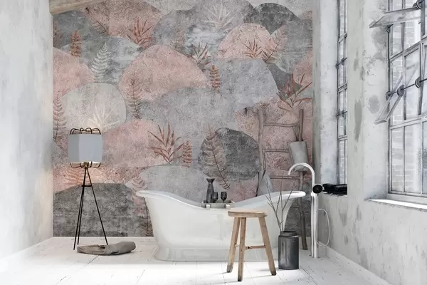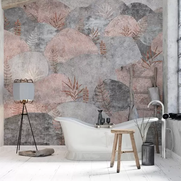 Fototapeten Steine mit Pflanzen, Farn, nordischen, rustikalen Stil, grau und rosa Farben N° w04064v1