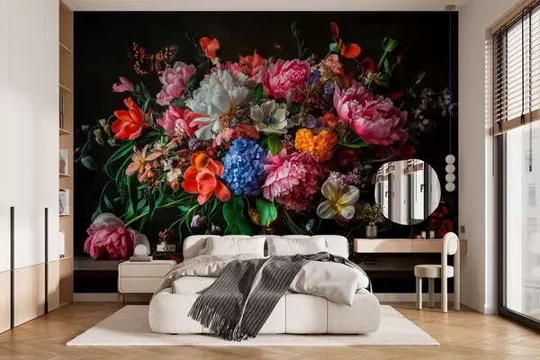 Fototapeten blumenstrauß im Stil der holländischen Ölmalerei des XVII. Jahrhunderts mit einer üppigen Blumenkomposition N° w04078