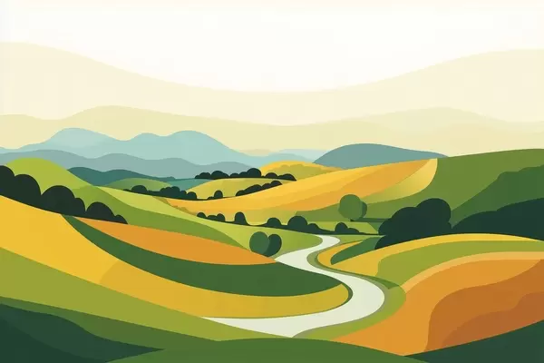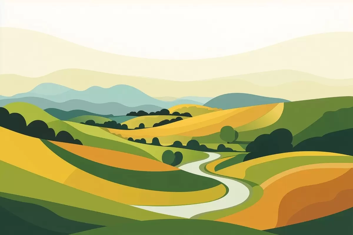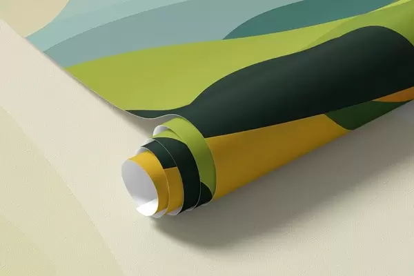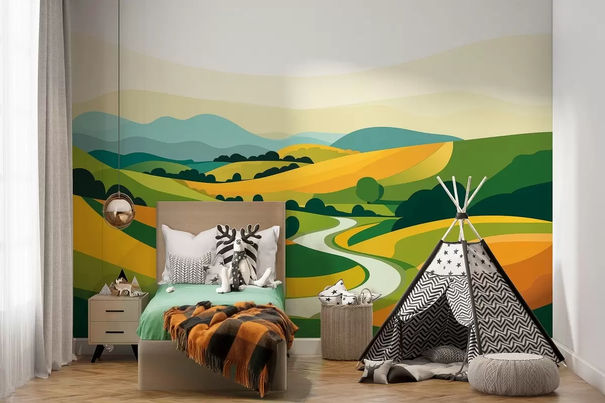 Fototapeten Abstrakte Landschaft mit Hügeln und Bäumen, lebendige Farben N° w04116