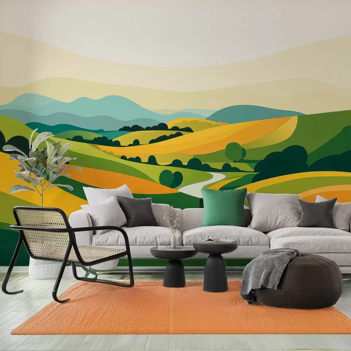 Fototapeten Abstrakte Landschaft mit Hügeln und Bäumen, lebendige Farben N° w04116