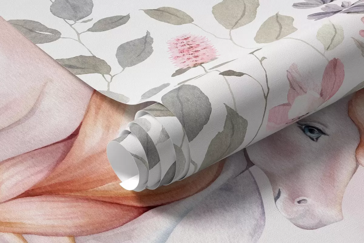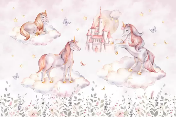 Fototapeten Einhörner in den Wolken mit Sternen, Schmetterlingen und Blumen N° w04165