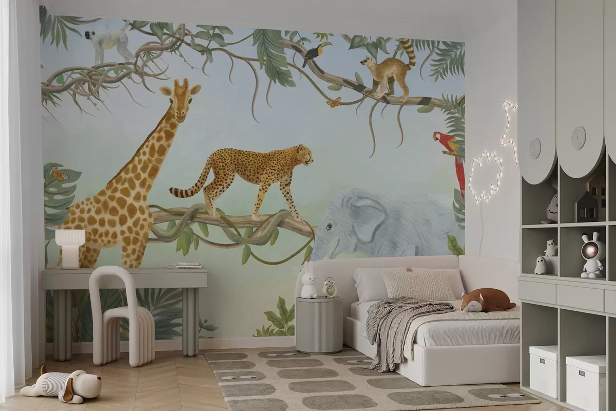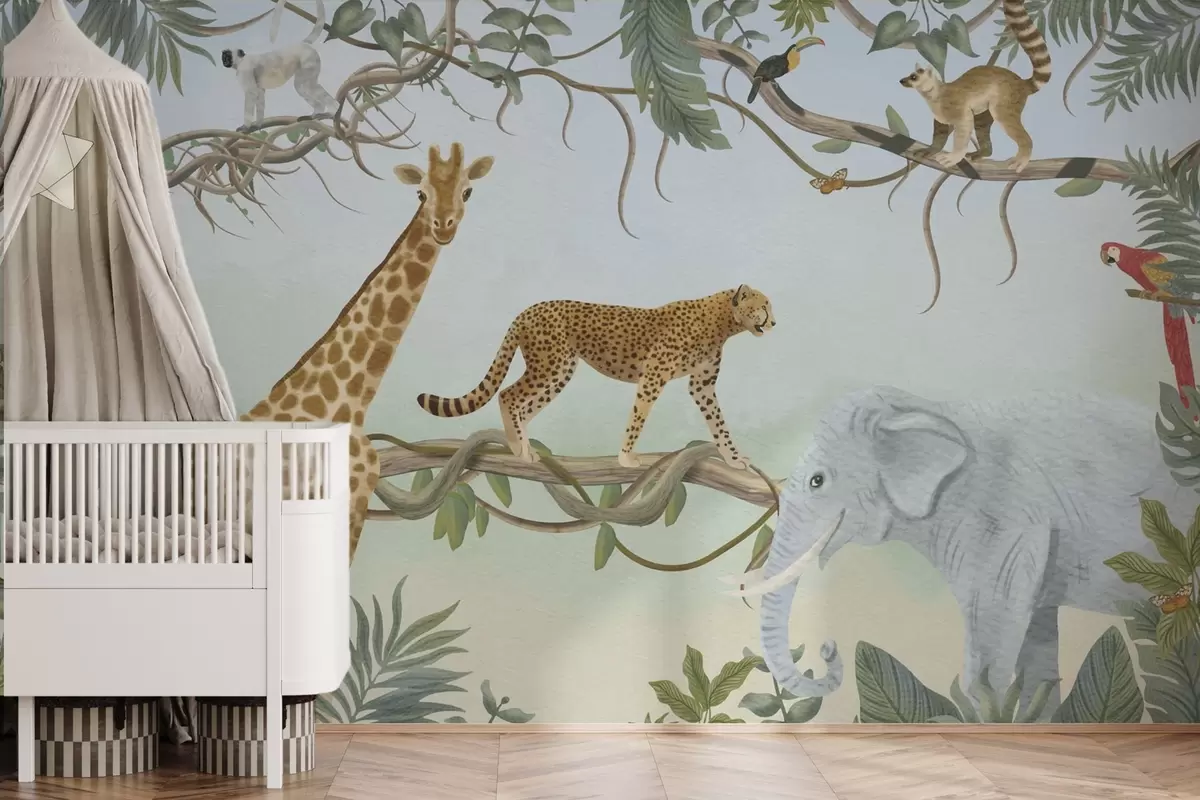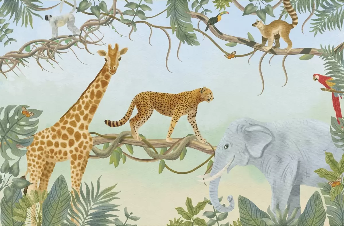 Fototapeten Dschungel-Illustration mit Giraffe, Gepard und Elefant N° w04194