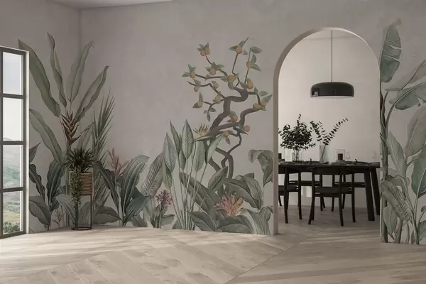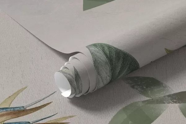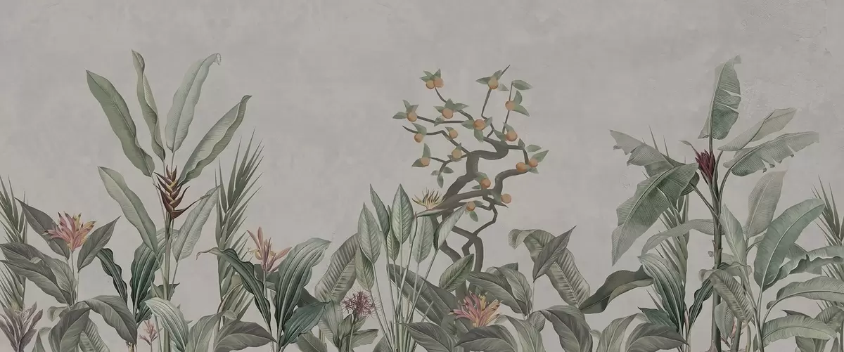 Fototapeten Tropische Komposition mit Pflanzen und Baum auf einem gräulichen Hintergrund N° w04201v1