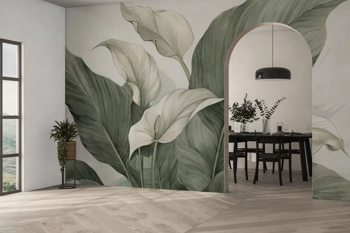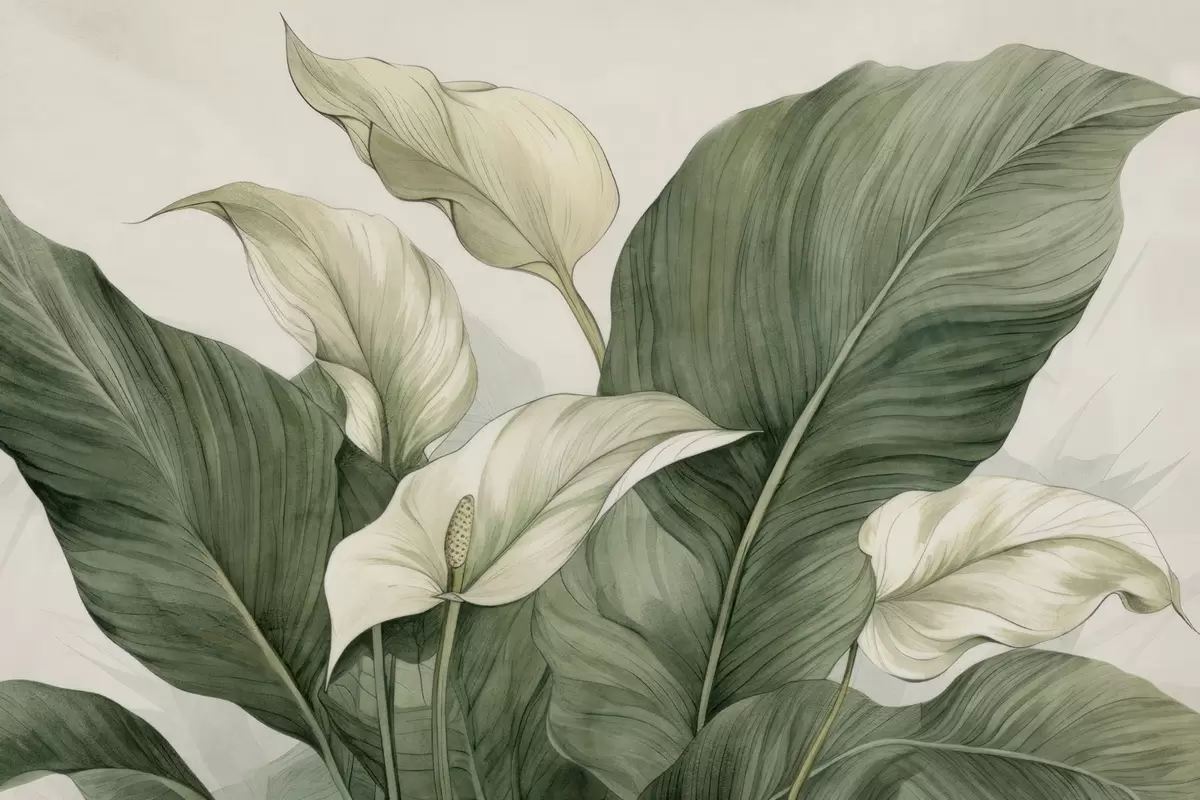 Fototapeten Nahaufnahme einer blühenden Spathiphyllum mit großen Blättern N° w04263