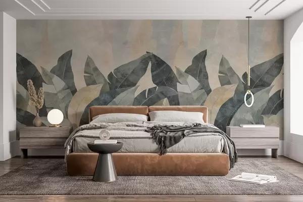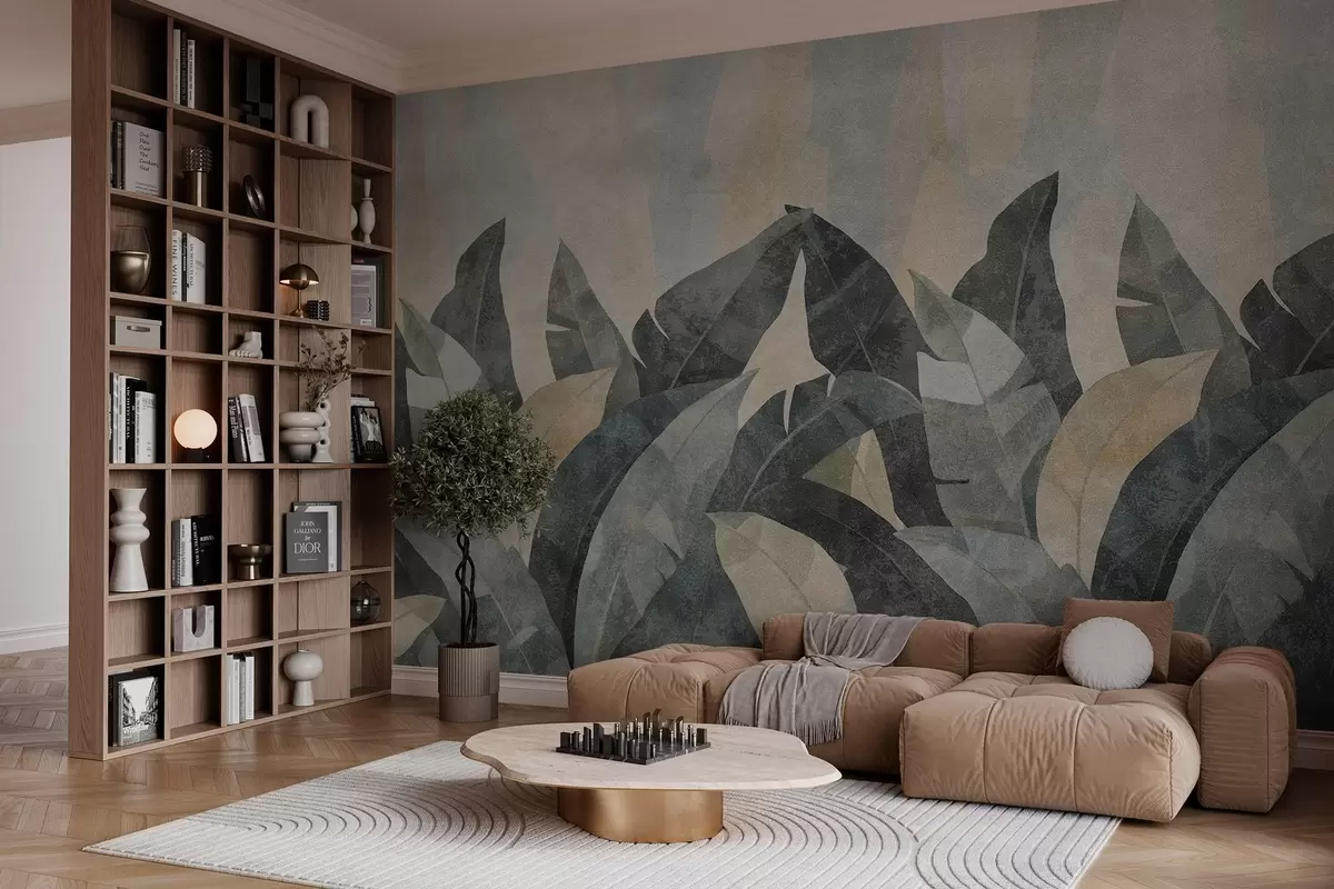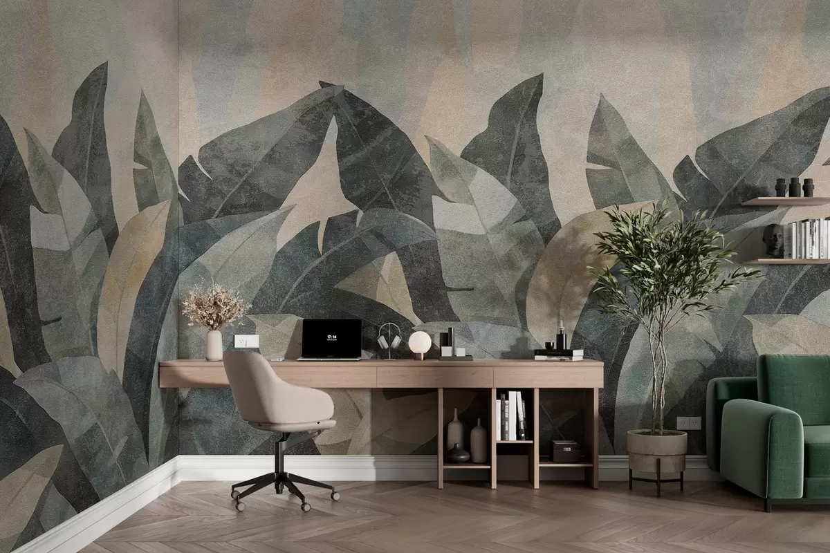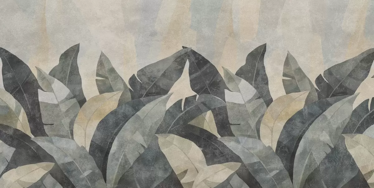 Fototapeten strukturierte Bananenblätter in Naturtönen von Beige, Grün und Grau N° w04285