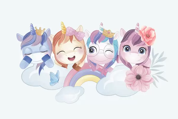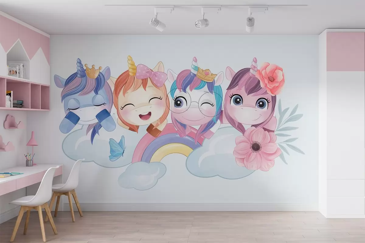 Fototapeten Niedliche Einhörner zwischen Wolken und Regenbögen N° w04298