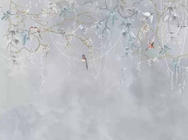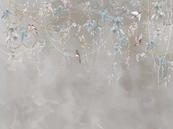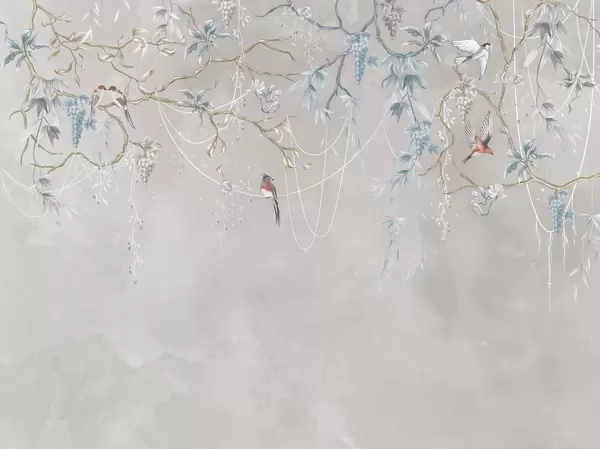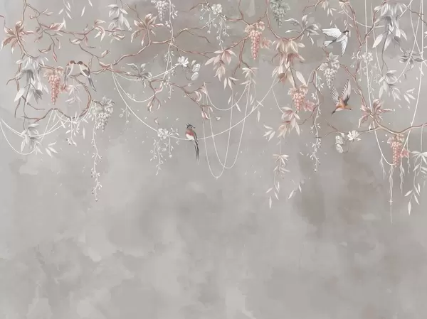 Fototapeten Zweige mit Trauben und Vögeln auf warmem grau-rosa Hintergrund N° w04302