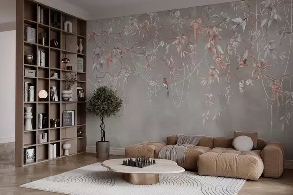 Fototapeten Zweige mit Trauben und Vögeln auf warmem grau-rosa Hintergrund N° w04302