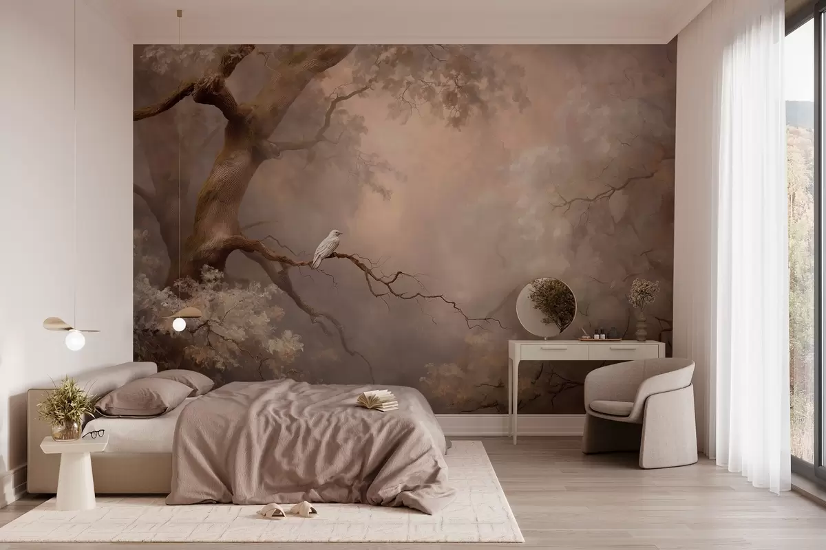 Fototapeten mystischer Wald mit einem weißen Vogel N° w04314
