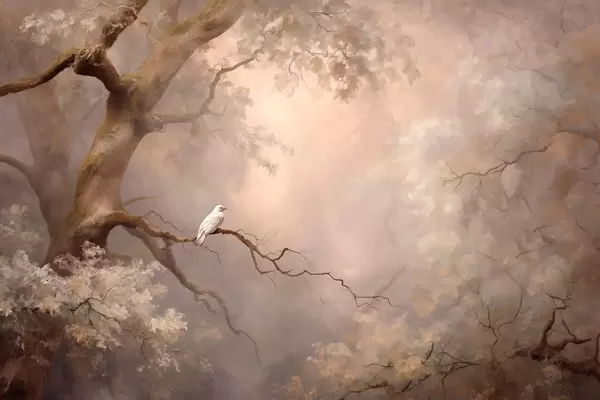 Fototapeten mystischer Wald mit einem weißen Vogel N° w04314