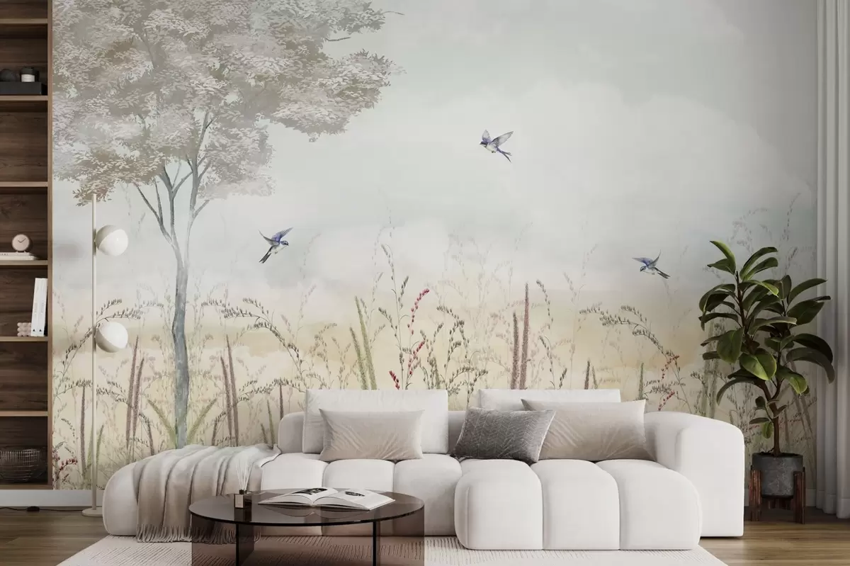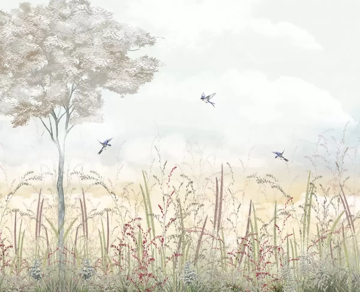 Fototapeten Landschaft mit Baum, Vögeln und Wiesengräsern N° w04350
