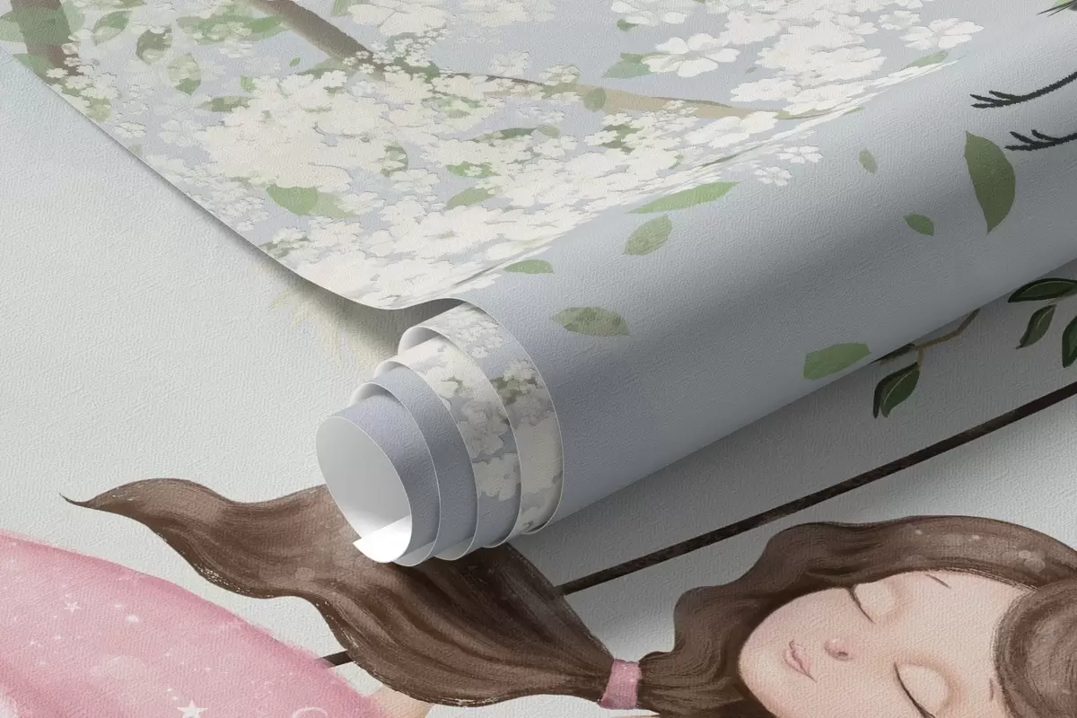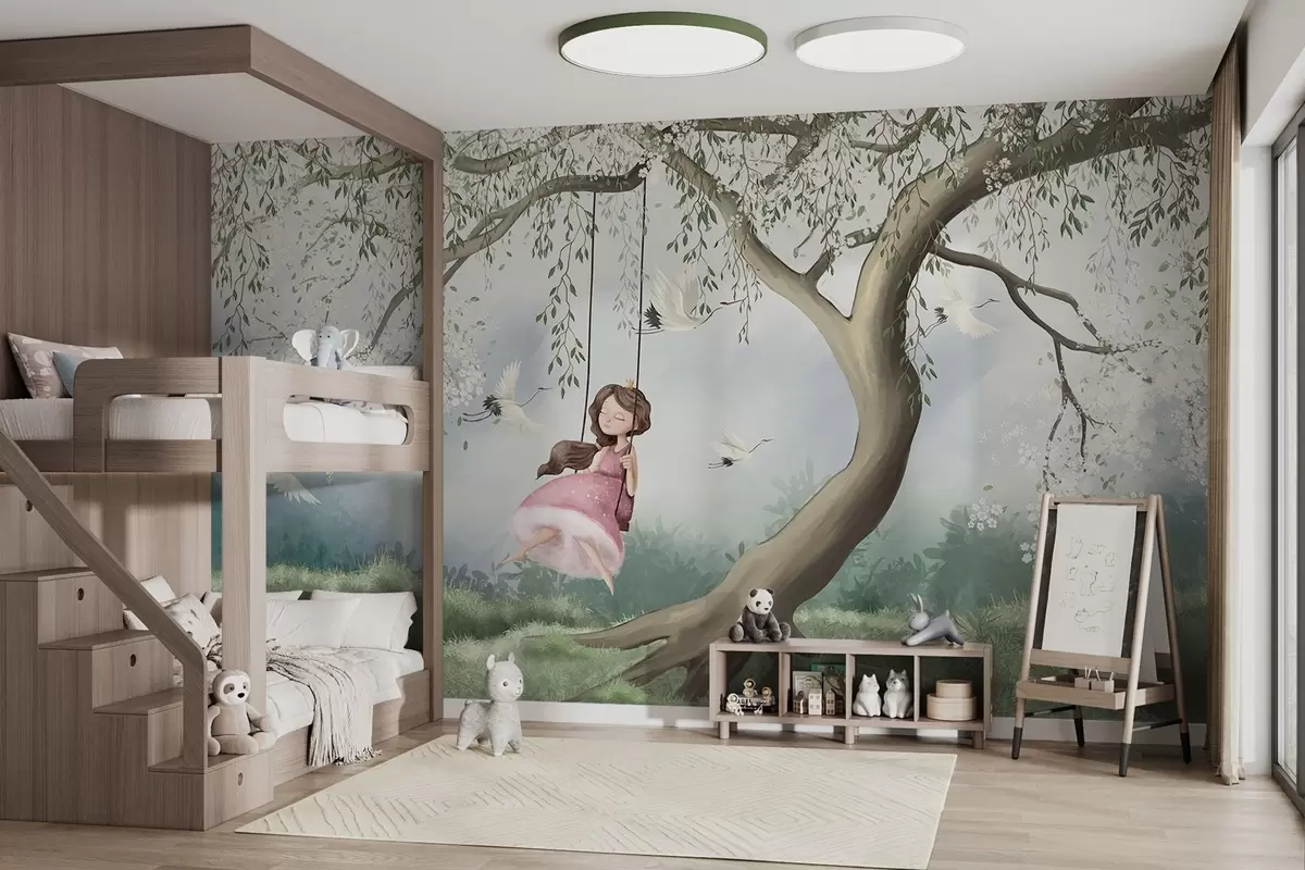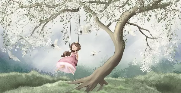 Fototapeten Mädchen auf Schaukel unter blühendem Baum mit umherfliegenden Vögeln N° w04370