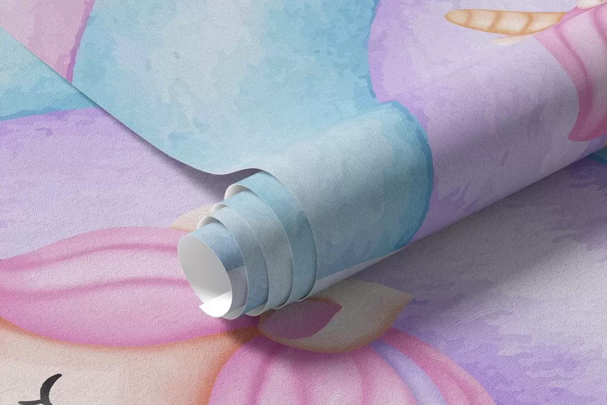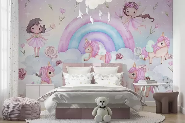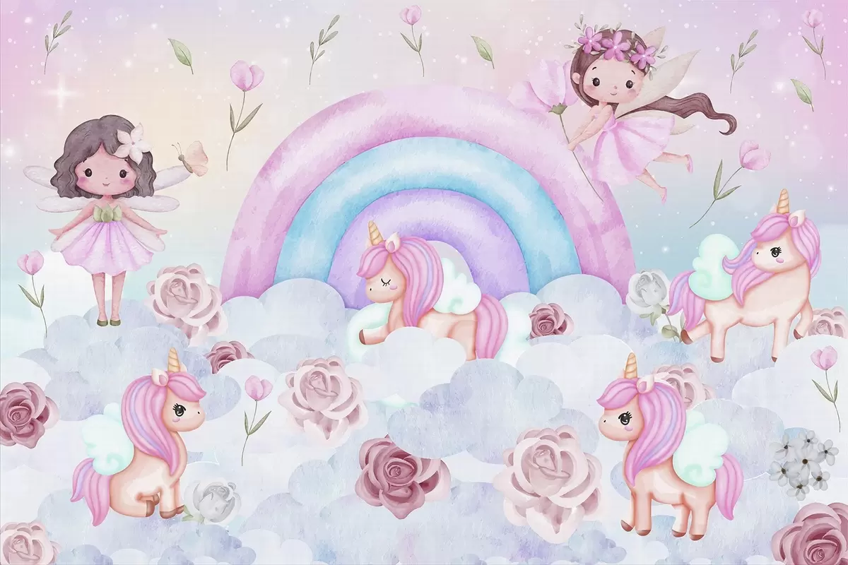 Fototapeten Feen und Einhörner zwischen Wolken und Regenbögen N° w04371