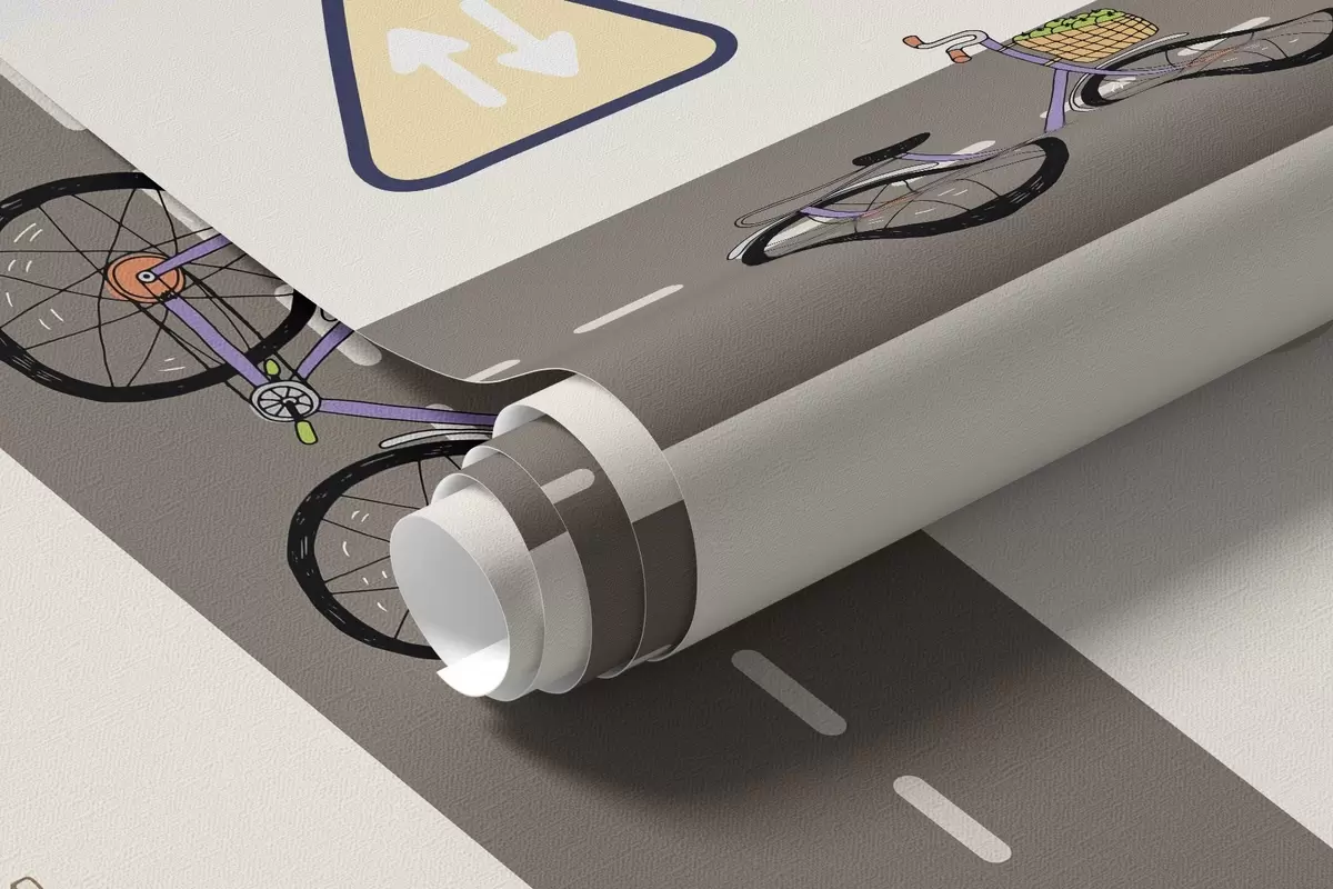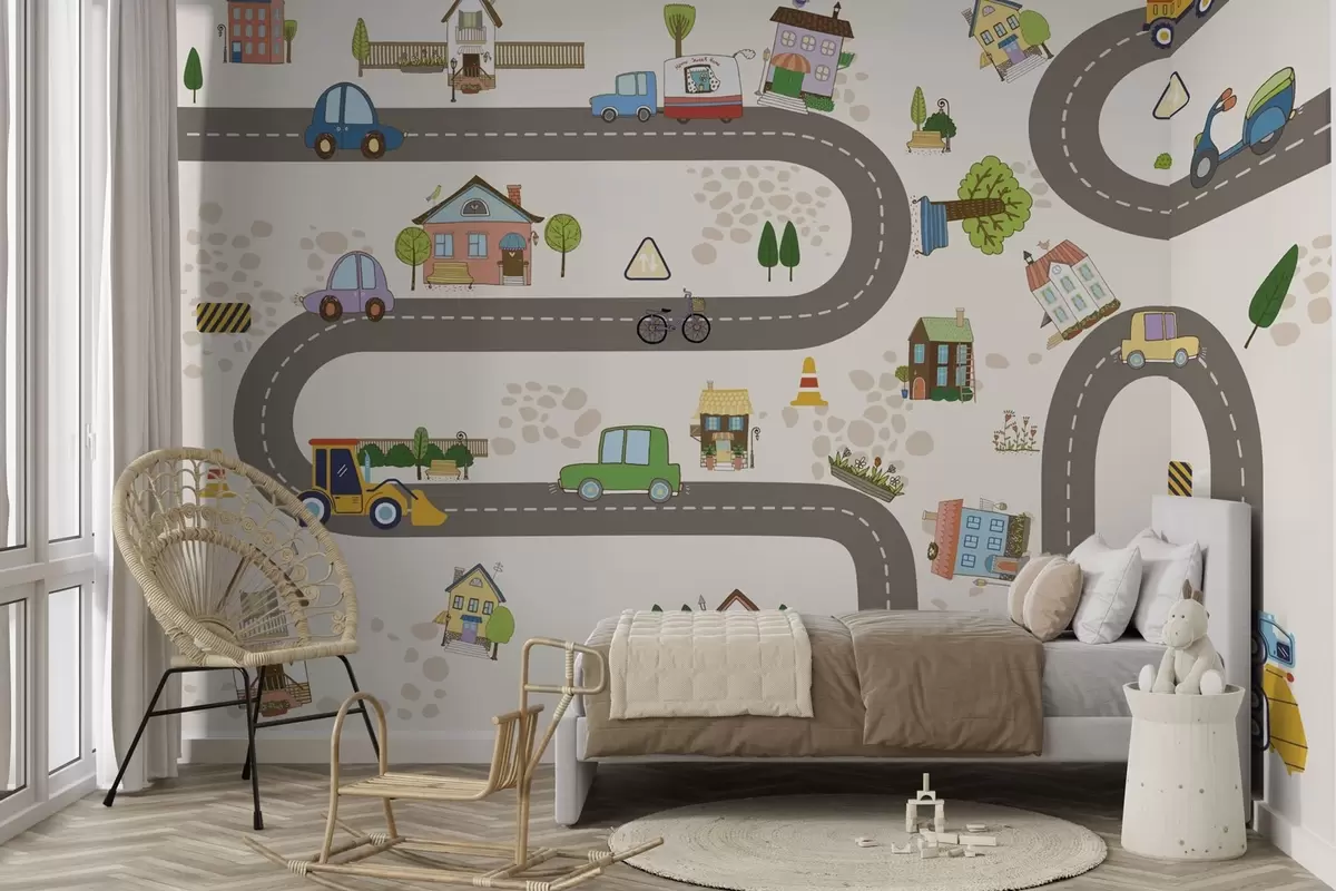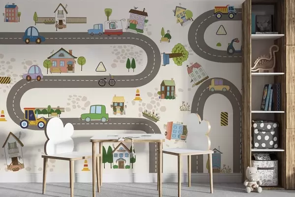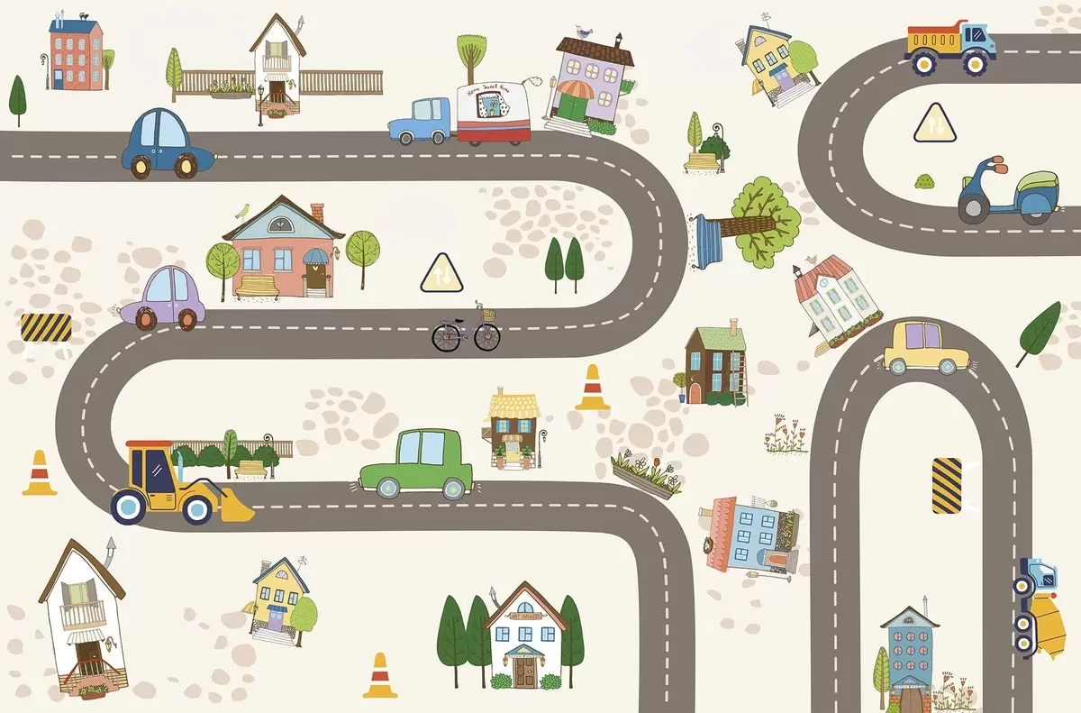 Fototapeten Kinderstraße mit Autos und bunten Häusern N° w04404