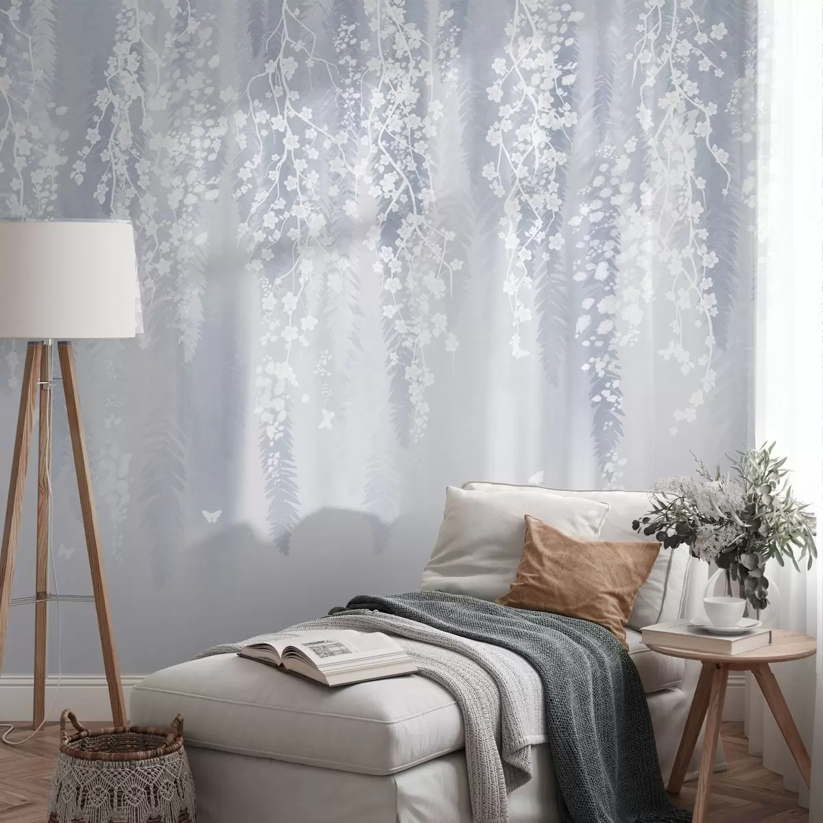 Fototapeten Kühle blaue Version von Zweigen mit weißen Blüten N° w04417v2