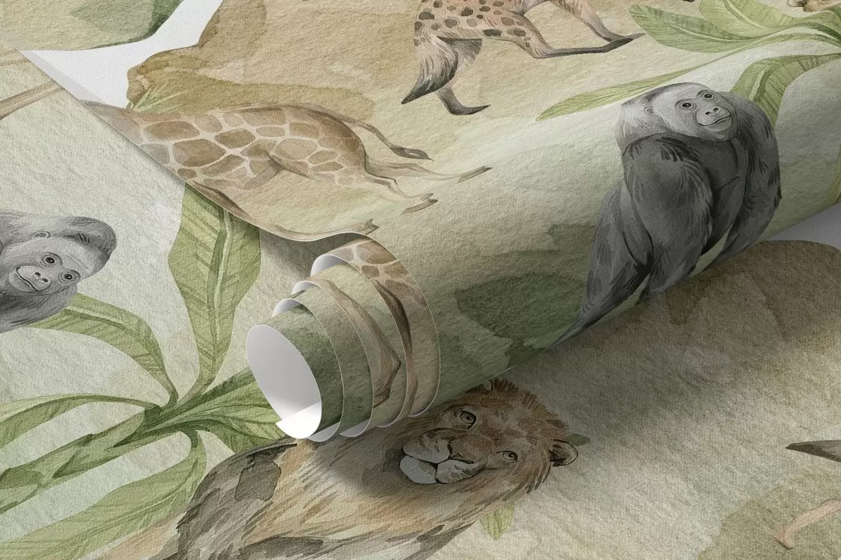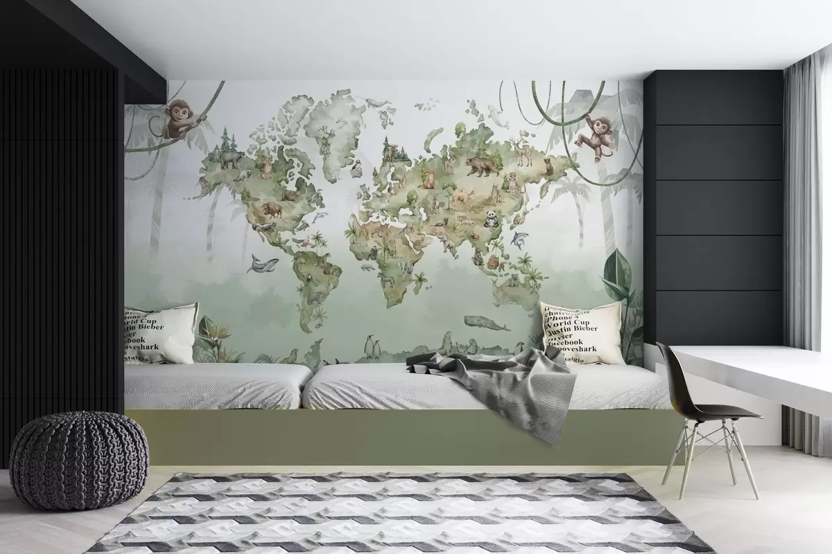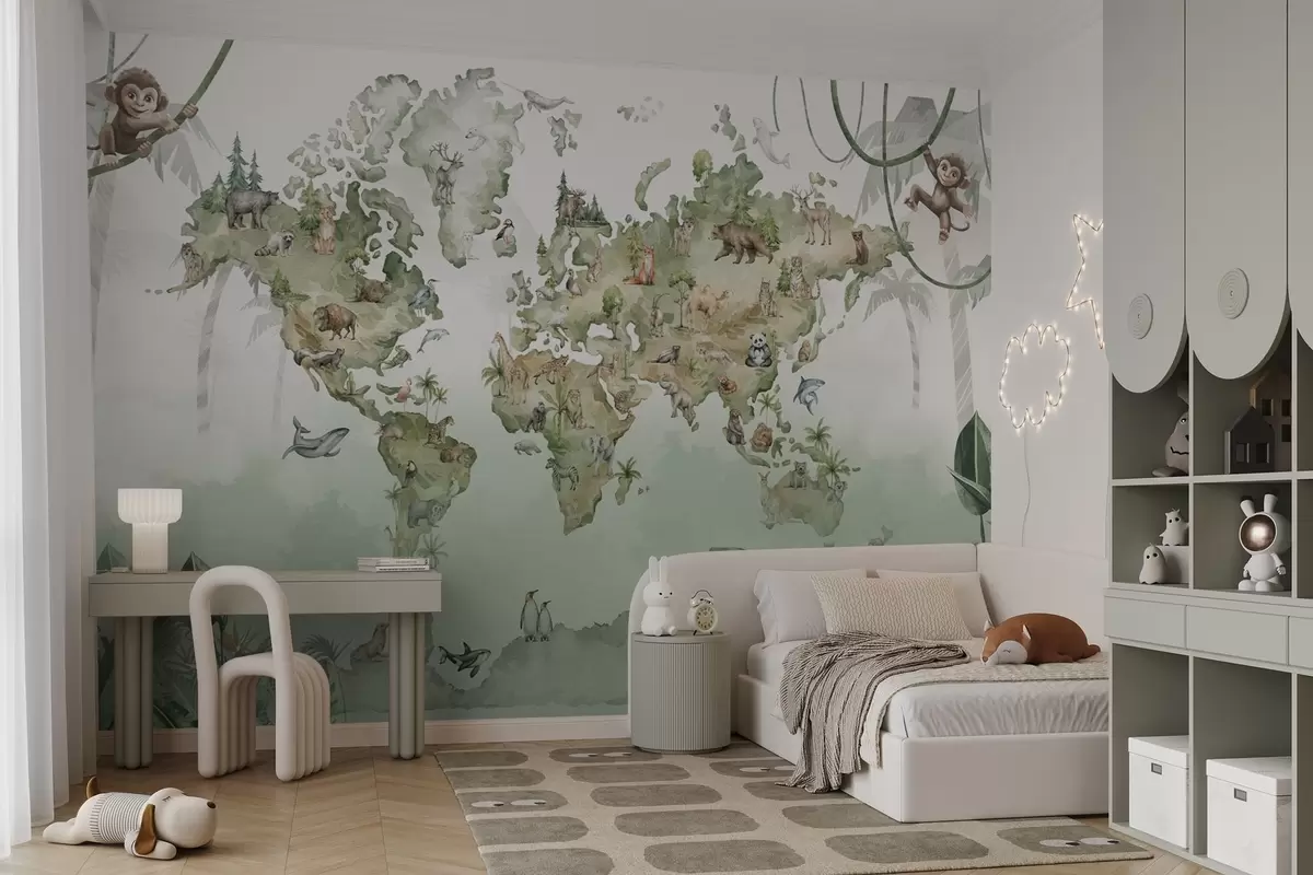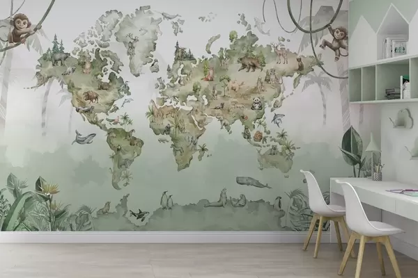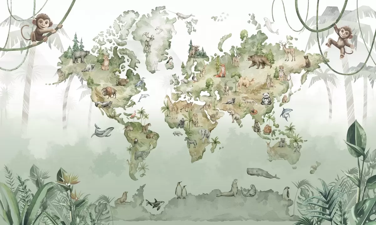 Fototapeten Weltkarte im Aquarellstil mit Tieren N° w04418