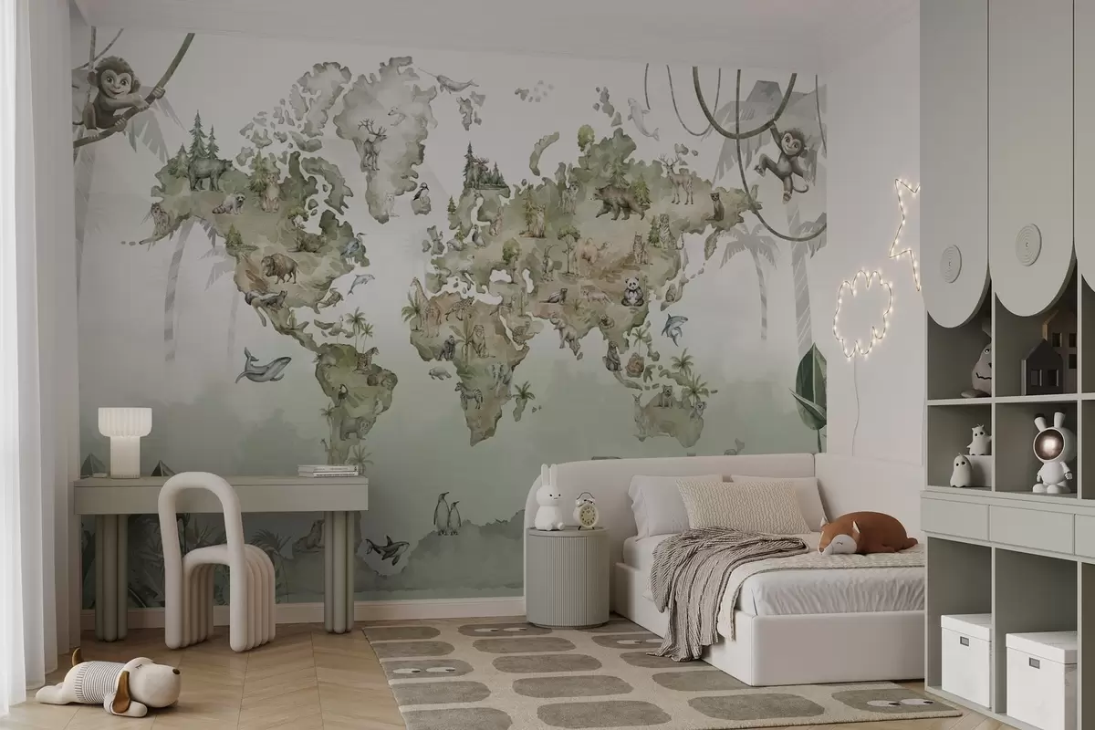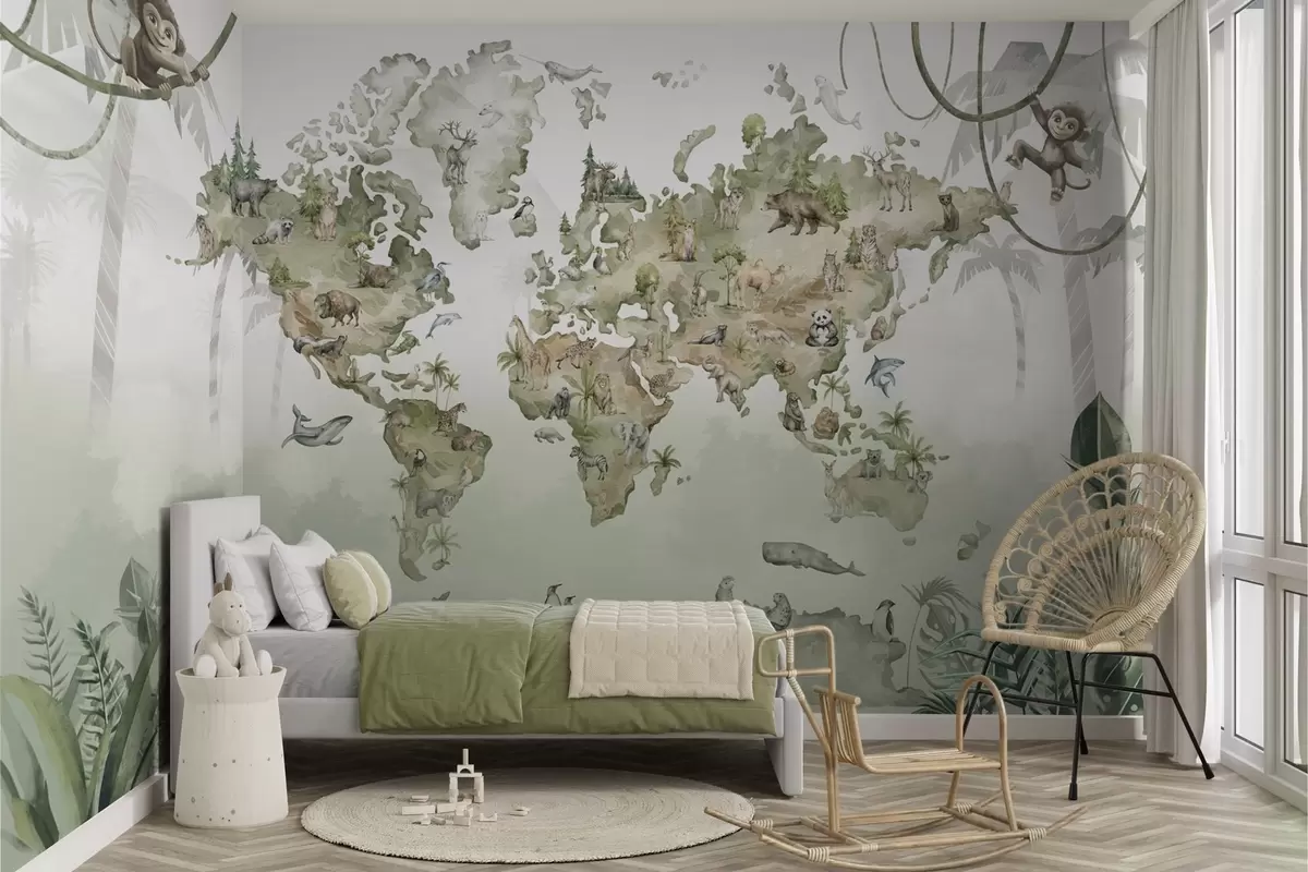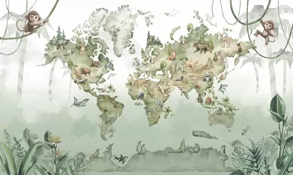 Fototapeten Illustrierte Weltkarte mit Tieren und Dschungel N° w04418v1
